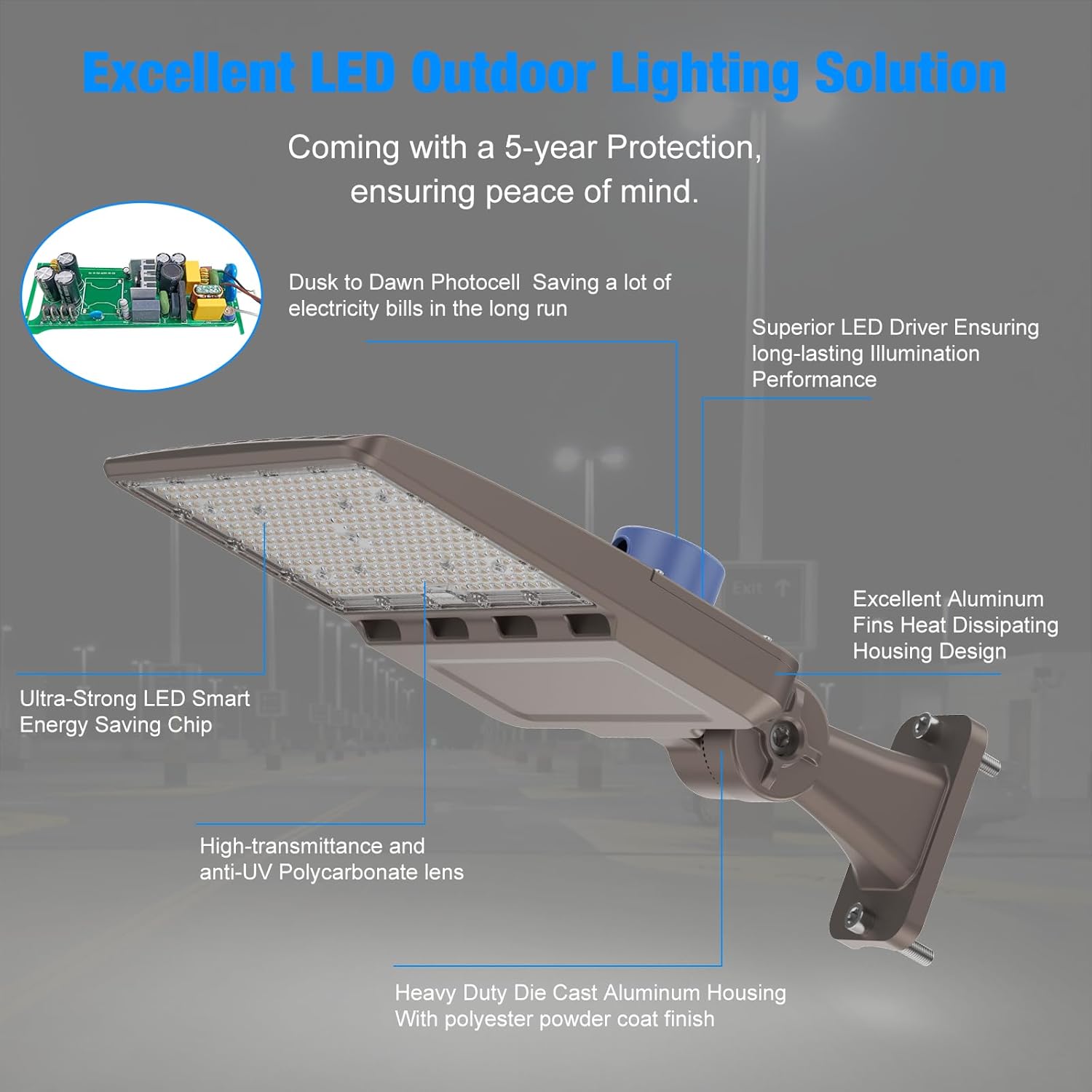 【Super Brightness】This LED parking Lot Light produces 100-277V, 42,000lm brightness of 5000k, bright as daylight. Perfect match the brightness of the illuminating for outdoor activities in a dark environment in the parking lot, roadway, street, yard, backyard, garden, farms, garage, factory, docks and so on. With its robust construction, brilliant illumination, and superior performance, the parking lot light delivers unparalleled brightness and clarity, ensuring optimal visibility and security for your whole area.