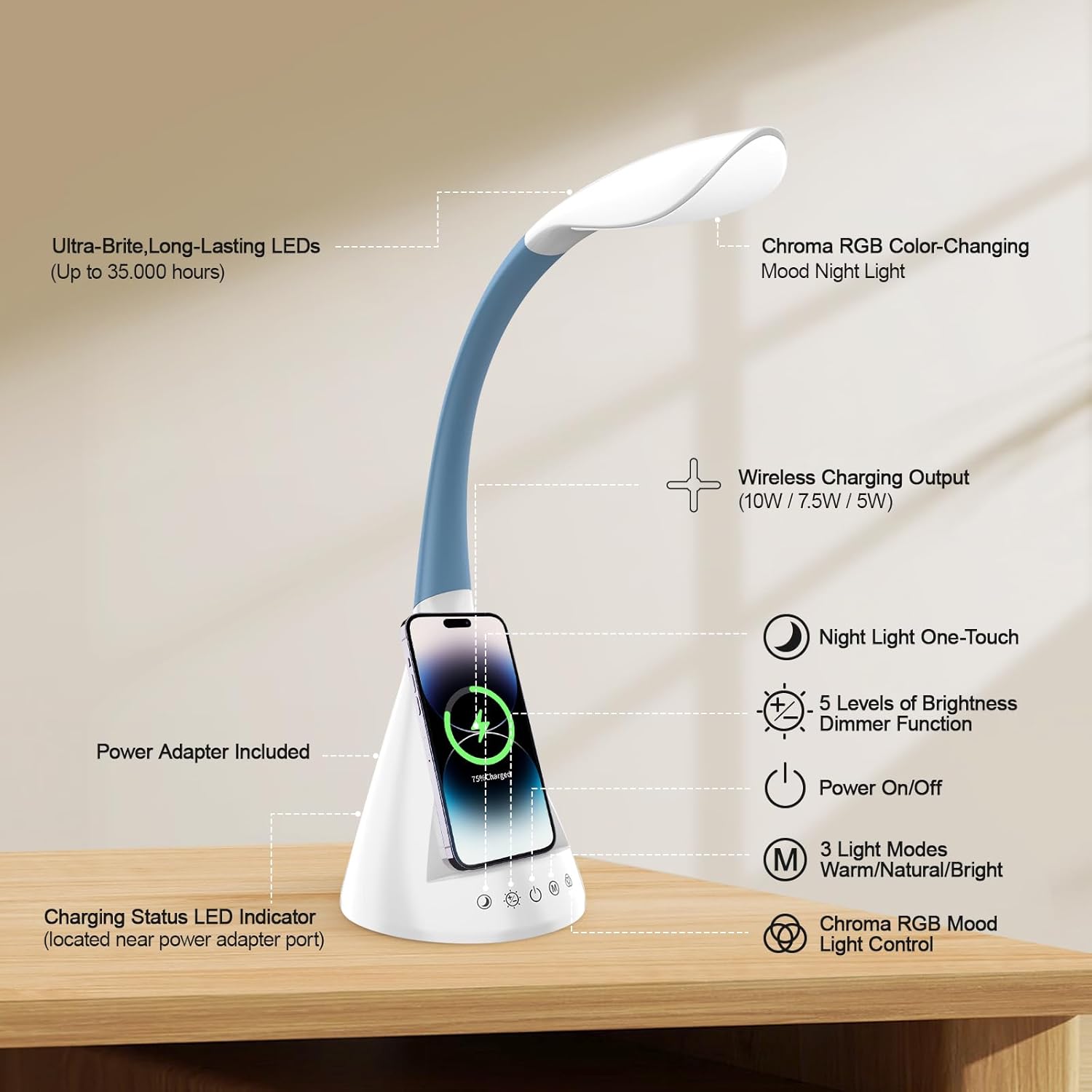 Transform your workspace with this versatile LED desk lamp that combines modern functionality with elegant design. The intuitive touch screen control puts 9 different lighting modes at your fingertips, while the 360-degree gooseneck allows precise positioning to prevent direct glare. Whether you’re working, reading, or creating, you’ll appreciate the thoughtful features including 5 RGB atmosphere lights that add a customizable ambiance to any room. The built-in 50W wireless fast charging pad keeps your devices powered up without cable clutter. Perfect for home offices, bedside tables, or children’s rooms, this lamp’s multiple brightness levels and color temperatures adapt to your needs throughout the day. The sleek white finish complements any decor, while the smart design prevents harsh direct light, making it ideal for extended use during work or study sessions. This lamp seamlessly blends practical illumination with modern convenience, making it an essential addition to any desk or workspace.