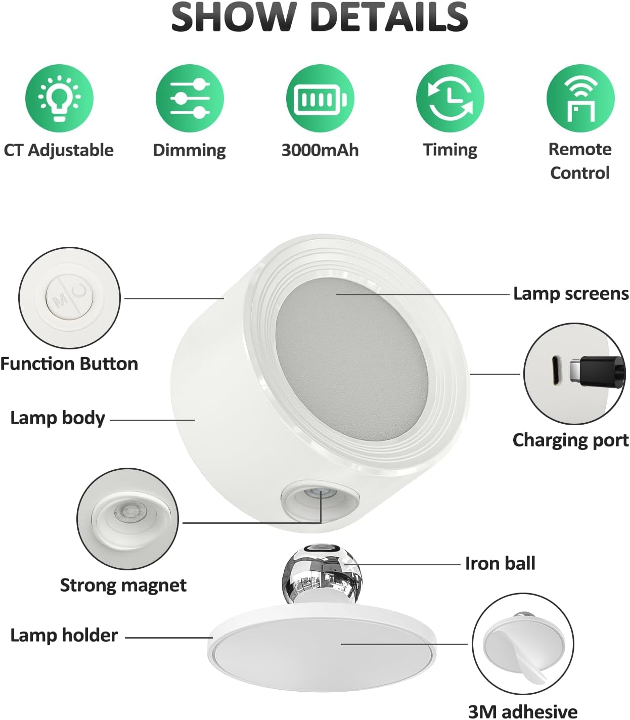 360° Free Rotations Magnetic Ball. This bedside lamp use magnetic technology. The lamp body and lamp holder are adsorbed by a magnetic iron ball, so the lamp body can rotate at any angle. You can take it off the wall in 1s and use it as flashlight, removable light, portable light, emergency light etc. Adjust any angle according to your usage scenario.