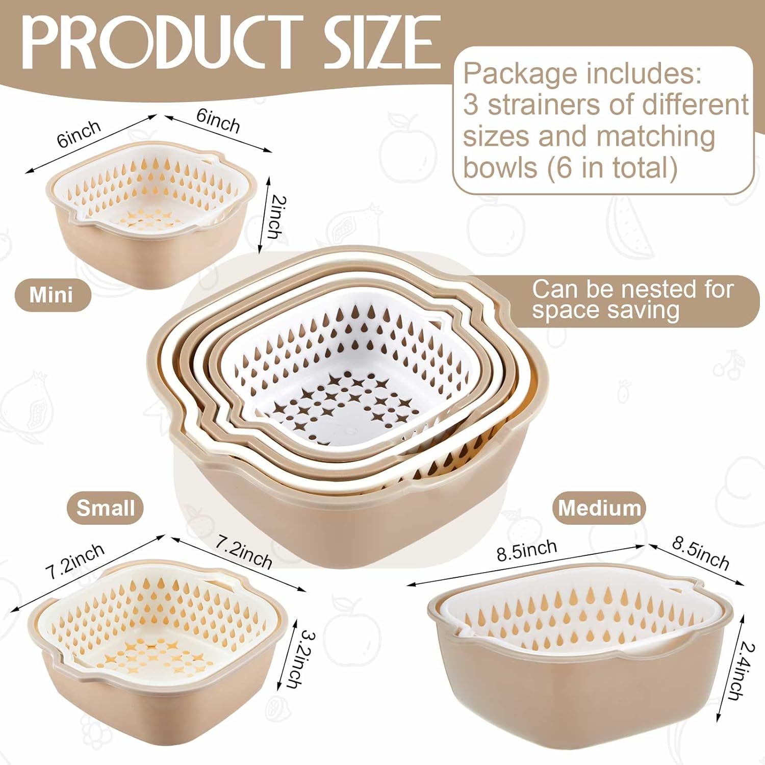 High Cost-effectiveness: the set includes 4 sizes of drain baskets, including 8.5 x8.5×2.4 inches, 7.2×7.2×2.3 inches and 6x6x2 inches, with 3 matching vegetable washing bowls a total of 6 sets; Enough to wash, rinse and drain fruits, vegetables and other foods, you can use them according to your needs