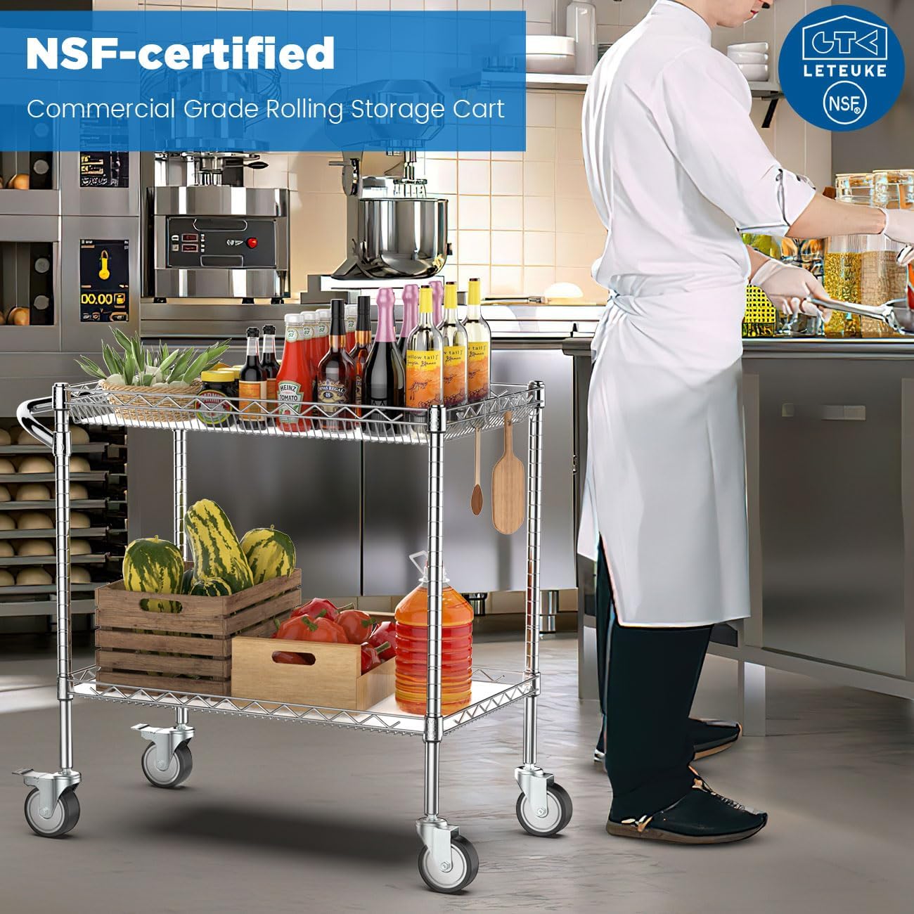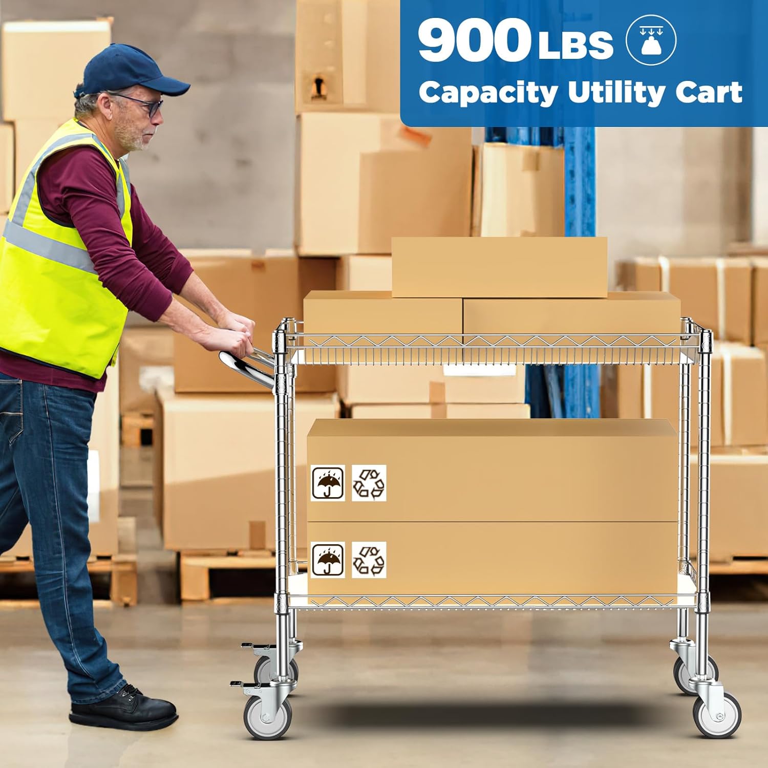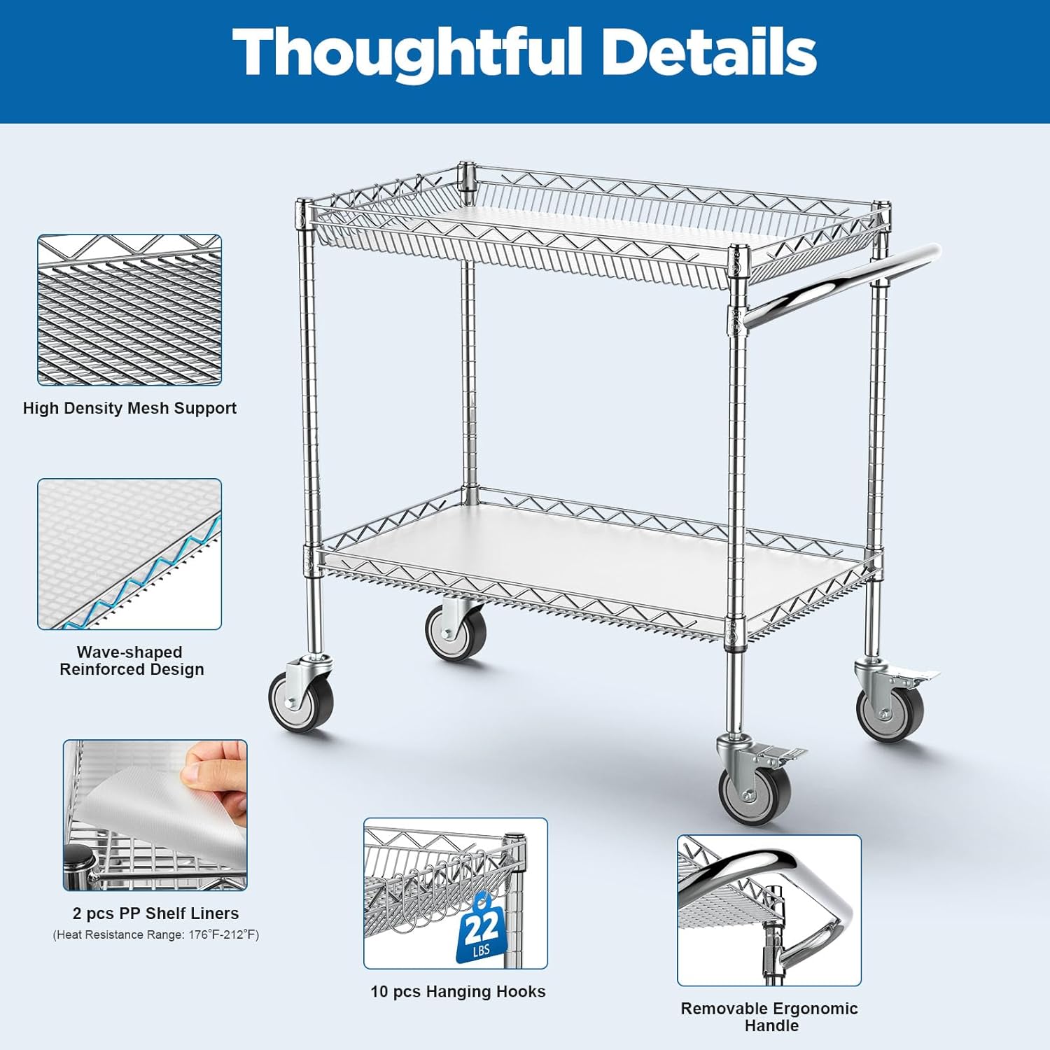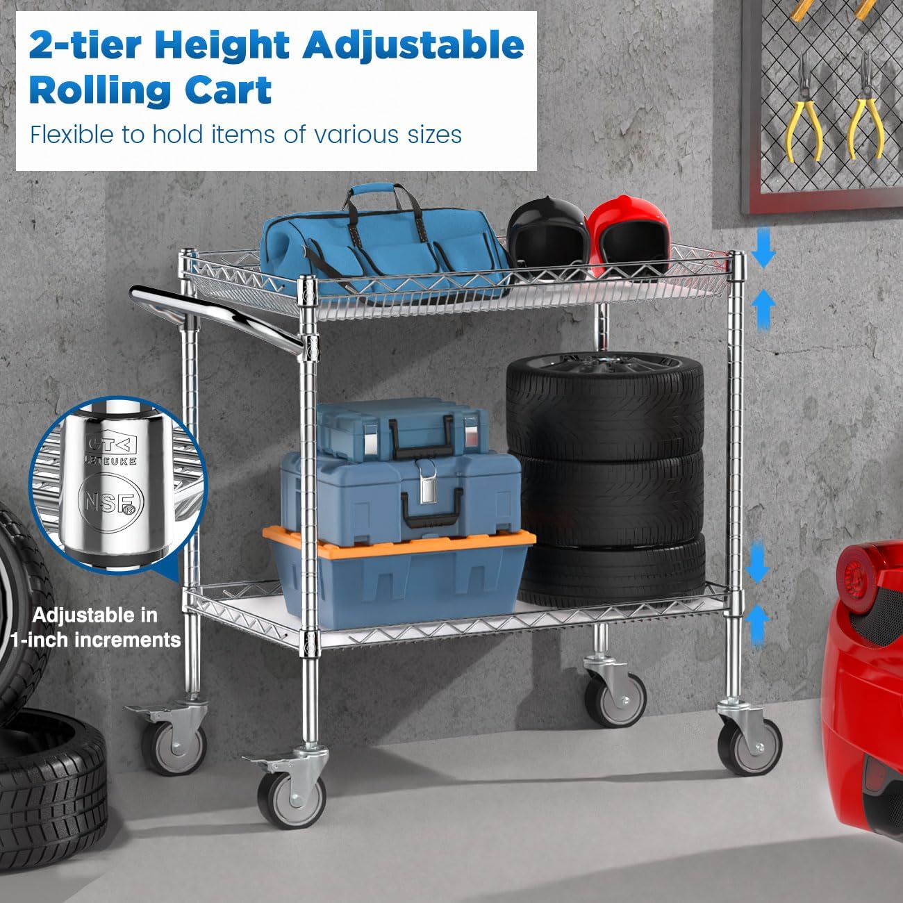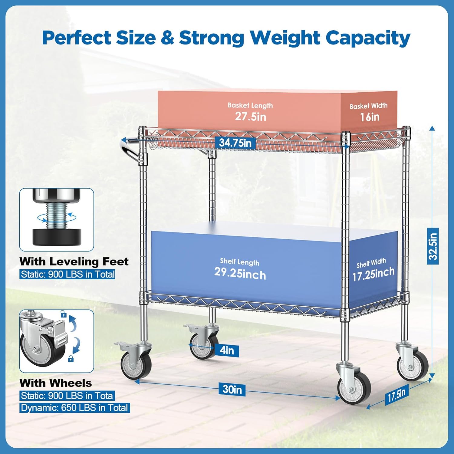 【2-Tier Adjustable Wire Mesh Shelves】: Snap the clips to fix the adjustable shelves. NOTE: The clips of the same shelf must be fixed at the same height. Each layer is height adjustable in 1 inch increments, you can adjust the height freely according to the items of different sizes. 2-Tier utility cart is simple in structure, comes with required parts and a detailed instruction, easy to assemble.