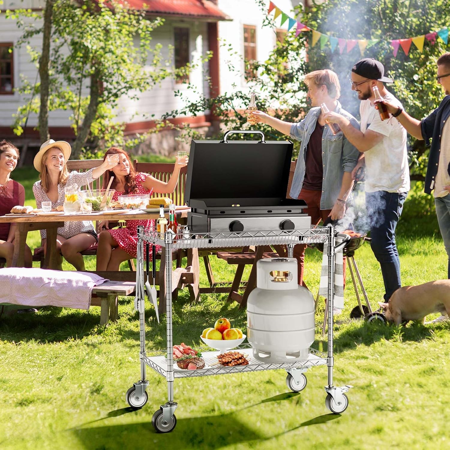 【2-Tier Space, Wide Adaptability】This metal grill table for outside measures (without handle) 30″ L x 18″ W x 33″ H. 2-tier adjustable wire mesh shelves, you can adjust the height freely. Total load capacity is 900lbs, suitable for holding Blackstone 17”/22” grill, Ninja grill, Ooni pizza ovens, table top grill, propane camping stove propane, and other portable outdoor cooking equipment.