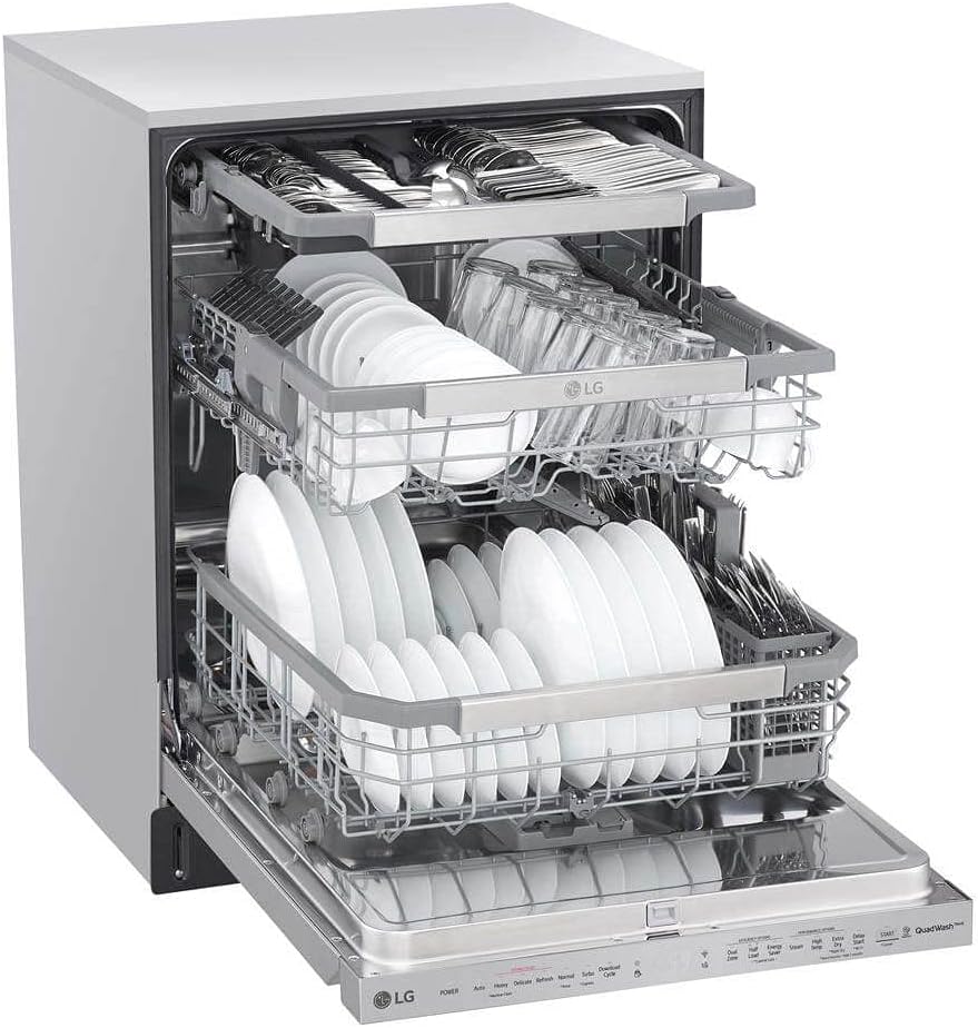 QuadWash™ System TrueSteam® Height Adjustable 3rd Rack Glide Rail PrintProof™ Finish LoDecibel™ Operation (44dB) Discover ThinQ Care within the ThinQ app — proactive smart alerts to keep your appliances running smoothly. Get notifications about usage, maintenance, plus early diagnosis right on your smartphone.* LG’s exclusive QuadWash™ technology gets dishes clean the first time. With four spray arms instead of just two, QuadWash™ uses Multi-Motion arms that rotate back and forth while spinning to power-clean dishes from multiple angles throughout the entire cycle. LG TrueSteam® uses the power of steam to penetrate food residue and help eliminate water spots by up to 60%*. *Percent in water spot reduction compared to comparable LG non-steam dishwasher on delicate wash cycle. Results may vary by model. Results based on test with LG LDF7774ST as of Feb. 2018. Creating a dynamic table begins with sparkling dishes and glassware – the kind only Dynamic Dry enhanced with TrueSteam® can deliver. From thoroughly drying to eliminating water spots from wine glasses, you can throw in the towel and stop drying by hand. Use the handy slider to adjust the 3rd rack height—even when fully loaded—to make room for taller items at the last minute. Not only can you save time and wash fewer loads, it’s also a convenient spot for hard-to-fit items like flatware, long-handled utensils or small espresso cups. PrintProof™ finish resists fingerprints and smudges to keep your kitchen looking its best. Available in black and classic stainless steel, now you can have all of the things you love about stainless steel appliances—the premium look, the professional-grade durability—without the need for special cleaners or constant attention. Plus, it easily wipes clean with a soft, dry cloth. Series LG Color PrintProof™ Stainless Steel Control Panel Location Top Control TrueSteam® Yes QuadWash® Yes Total Place Settings 15 Upper Rack Dish Height Limit 7.1″ Lower Rack Dish Height Limit 12.5″ Cutlery Baskets Yes Cup Rack Yes Stemware Holder Yes Fold Down Tines Yes (Half Fold on Upper & Half (Smart), Half (Normal) Fold on Lower) BPA-Free Nylon Coated Racks and Tines Yes Rack Handle Yes (Upper) No (Lower) Glide Rail Yes EasyRack™ Plus System Yes Height Adjustable Upper Rack Yes Height-Adjustable 3rd Rack Yes Control Panel Location Top Control Electronic Controls Fully Integrated Control Panel Time Remaining Indicator LED Tub Material NeveRust™ Stainless Steel Tub Light No Handle Pocket Handle All Available Colors PrintProof™ Stainless Steel, PrintProof™ Black Stainless Steel Fingerprint Resistant Yes TrueSteam® Yes QuadWash® Yes Inverter Direct Drive Motor Yes LoDecibel™ Quiet Operation 44 dBA Number of Wash Cycles 10 (Auto, Heavy, Delicate, Refresh, Normal, Turbo, Download Cycle, Machine Clean, Rinse, Express) Number of Options 9 (Dual Zone, Half Load, Energy Saver, Steam, High Temp, Extra Dry, Delay Start, Control Lock, Night Dry) Number of Spray Arms 3 (Top, Upper, Lower) SenseClean™ Wash System Yes Vario Wash Yes Detergent and Rinse-Aid Dispenser Yes Hybrid Condensing Drying System Yes End of Cycle Indicator Yes (Beeper + END indication on display) Hidden Water Heater Yes Safety Float Switch (Leaks) Yes Soil (Turbidity) Sensor Yes Tub Insulation (Damping Sheet, Sound Absorbing Material (felt), Base) Yes BPA-Free Nylon Coated Racks and Tines Yes Anti-Bacterial Treatment (Drain hose) Yes Balanced Door Yes 3-Stage Filtration System Yes Wi-Fi Enabled Yes Works with Google Assistant and Amazon Alexa SmartDiagnosis™ Yes ENERGY STAR® Qualified Yes CEE Tier 1 Energy Use (kWh/Year) 258 kWh/Year Water Factor (WF) 2.9 Product Dimensions (in) (W x H x D) 23 3/4″ x 33 3/5″ x 24 3/5″ Product Weight (lbs) 87.3 lbs Depth with Door Closed with Handle (in) 24 3/5″ Depth with Door Open (in) 50 1/2″ Carton Dimensions (in) (W x H x D) 28″ x 34 7/10″ x 29 3/5″ Shipping Weight with Carton (lbs) 99.4 lbs Labor 1 Year Parts 1 Year Control Board and Rack Parts 5 Years Direct Drive Motor 10 Years Stainless Steel Door Liner or Tub Lifetime UPC 048231341691 1Free shipping not available for parts and accessories. Free shipping to qualifying US destinations in the contiguous United States; not available for P.O. Boxes, addresses outside the contiguous 48 states, international addresses, Army Post Office (APO), Diplomatic Post Office (DPO) and Fleet Post Office (FPO). *Percent in water spot reduction compared to comparable LG non-steam dishwasher on delicate wash cycle. Results may vary by model. Results based on test with LG LDF7774ST as of Feb. 2018. Prices, promotions and availability may vary by model, store, and online. Prices subject to change without notice. Quantities are limited. Check with your local retailers for their final price and availability. Simplify your life, streamline your kitchen and get spotless, sparkling dishes. LG’s sleek, powerful dishwashers feature innovative technology and stylish designs — for faster cleanup and a look you’ll love.Boasting top control and front control designs, LG dishwashers will blend seamlessly into your space. Of course, with a wide range of features they’ll also do an incredible job of cleaning your delicate dishware, sturdy cookware and everything in between. Discover just a few of the options available: Height-adjustable Third Rack: With more room to fit long flatware and small cups, you’ll get more functional space — and can do more dishes in a single load. EasyRack™ System: When you choose a dishwasher with the EasyRack System, you can quickly adjust the upper rack to accommodate larger pots, pans, platters and serving dishes below, and make room for everything. QuadWash™: Ultra-quiet, packed with innovative technology, and among the most energy-efficient in its class, the LG QuadWash™ dishwasher gives you maximum cleaning coverage, outstanding flexibility, and the ultimate in convenience. QuadWash technolog
