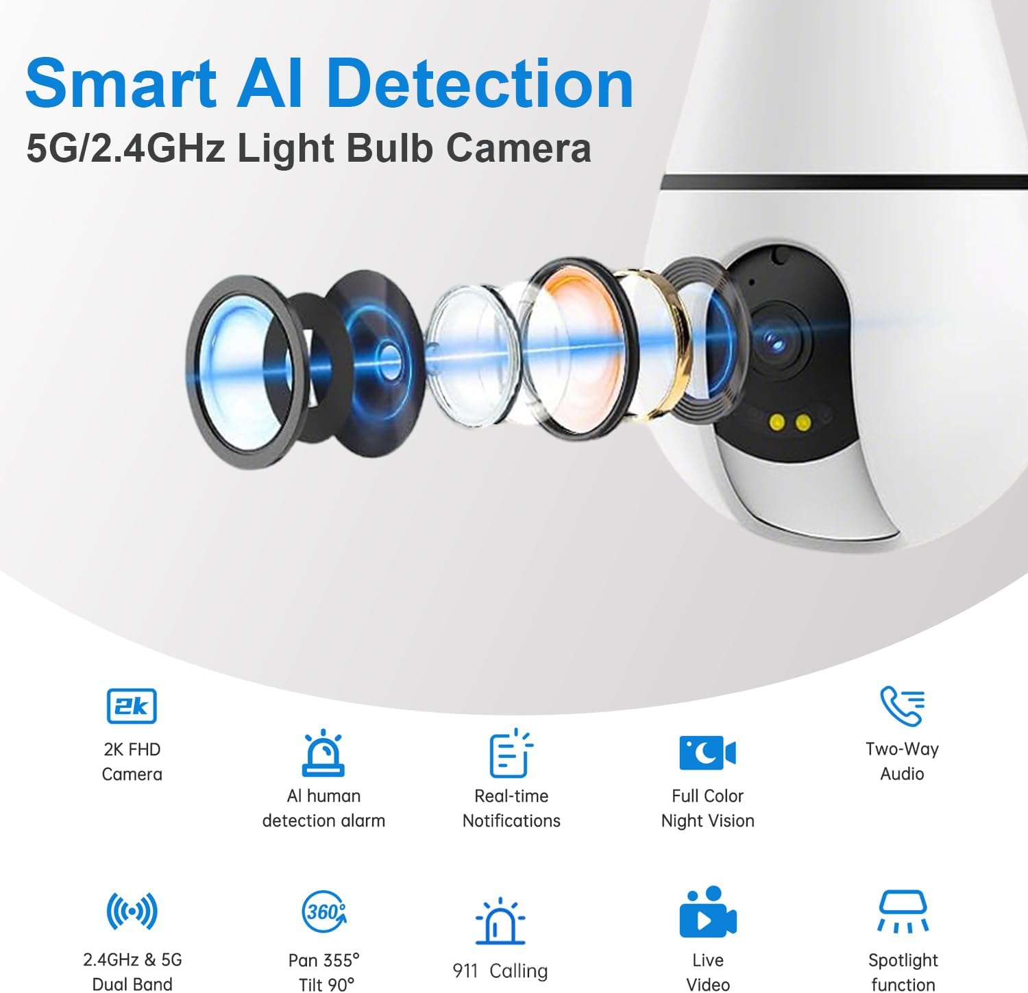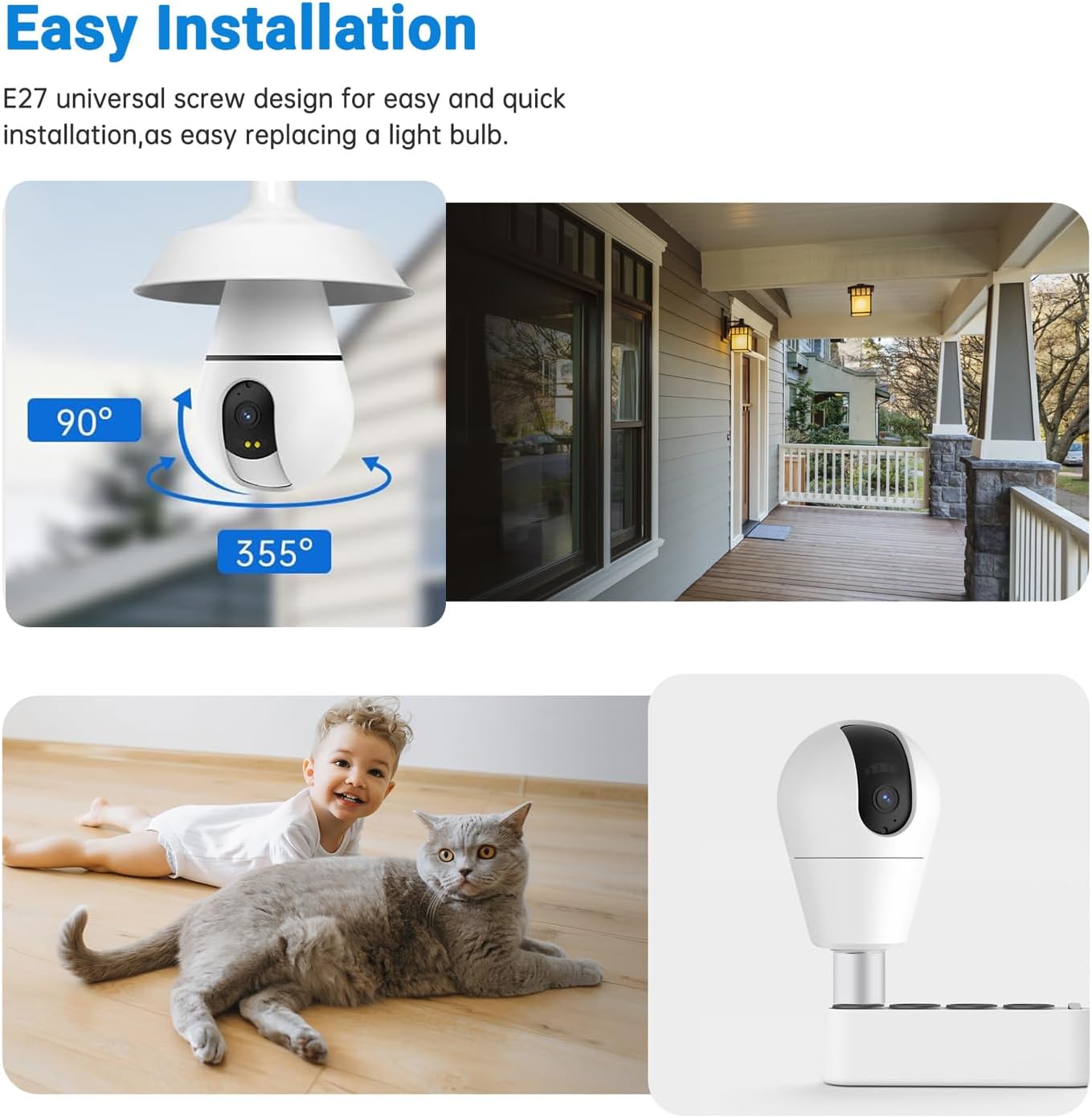 5/2.4GHz Bual Dand Wifi Camera: The latest 5G & 2.4G dual-band light bulb security cameras wireless outdoor have stronger signal reception, higher stability, longer distance to use, no lag and smoother real-time video compared to traditional 2.4G single-band light bulb camera. Simply screw the best light socket camera into the equipped E27/E26 bulb base (AC110/240V) and plug it into a power outlet, connect camera light bulb to your home wifi via InstaVision app.
