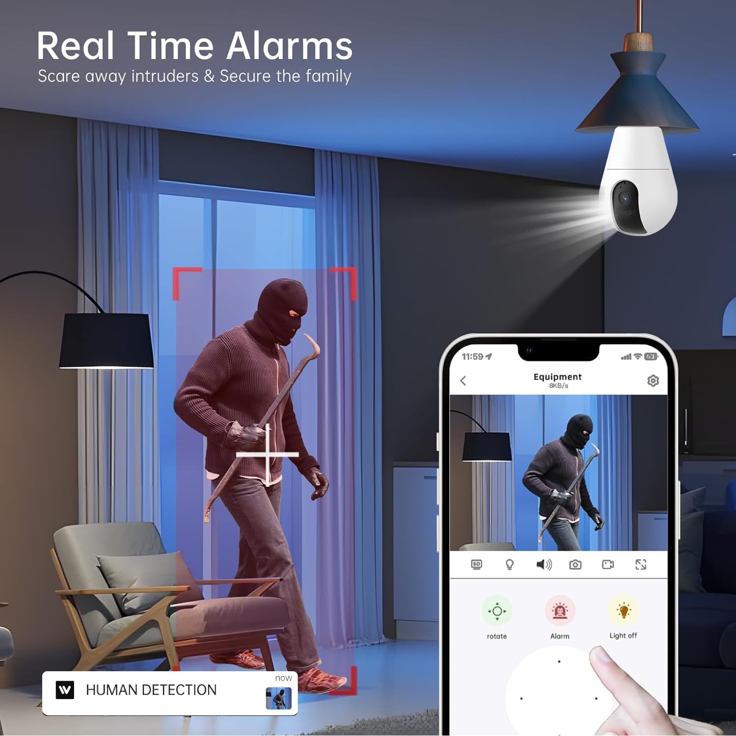 2K HD & 911 emergency call: light bulb camera outdoor 360 supports 2K 3MP HD image. Porch light cameras for home security ensuring you can see ultra-clear details both day and night with color/smart/infrared night vision mode. Our outdoor camera supports 911 emergency call activation when detecting unauthorized strangers. Upon detecting a person through AI-based stranger recognition, the system triggers alerts (e.g., siren, pop-up video) and allows users to manually initiate a 911 call via voice command or app. Once dialed, the camera automatically activates nearby surveillance to record the incident, ensuring accurate location data for emergency responders.