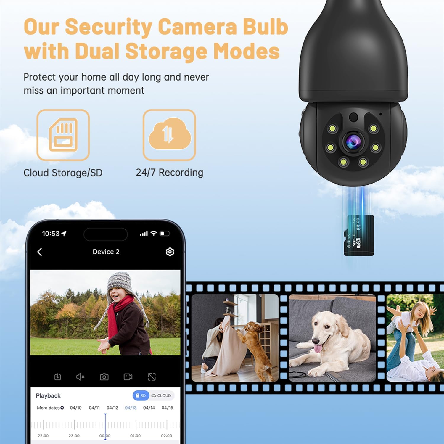 【Multi User Sharing and Optional Storage】 : The Light socket wireless bulb cameras for home security supports multiple users to watch videos. You can share the device with your family and friends through the app for synchronised video viewing. Light bulb camera wifi outdoor is capable of 24/7 recording, supports cloud storage (paid access required) and micro SD card storage up to 128G (not included).This home camera outdoor wirelesss is Alexa compatible, easy to install and simple to operate.