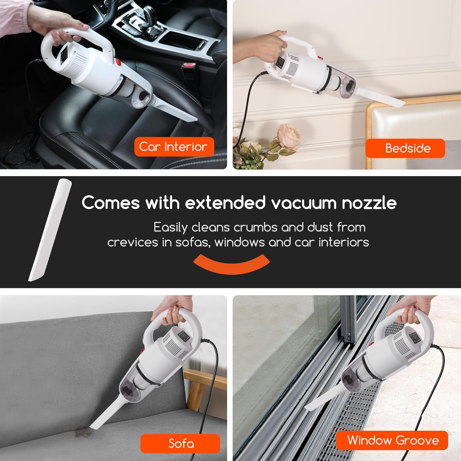 𝗖𝗼𝗿𝗱𝗲𝗱 𝗛𝗮𝗻𝗱𝗵𝗲𝗹𝗱 𝗩𝗮𝗰𝘂𝘂𝗺 – The specially designed 255-inch long power cord can easily clean the living room, kitchen, bedroom, etc. without frequent plugging and unplugging. Replace the long nozzle. This is a lightweight handheld vacuum cleaner that is very suitable for vacuuming sofa gaps, window grooves and hard-to-reach corners; it can also be used to clean the interior of the car, vacuuming quickly and efficiently.Equipped with three filters, it can meet the consumables needs for 6-12 months. When replacing, be careful to disassemble slowly to avoid dust falling.
