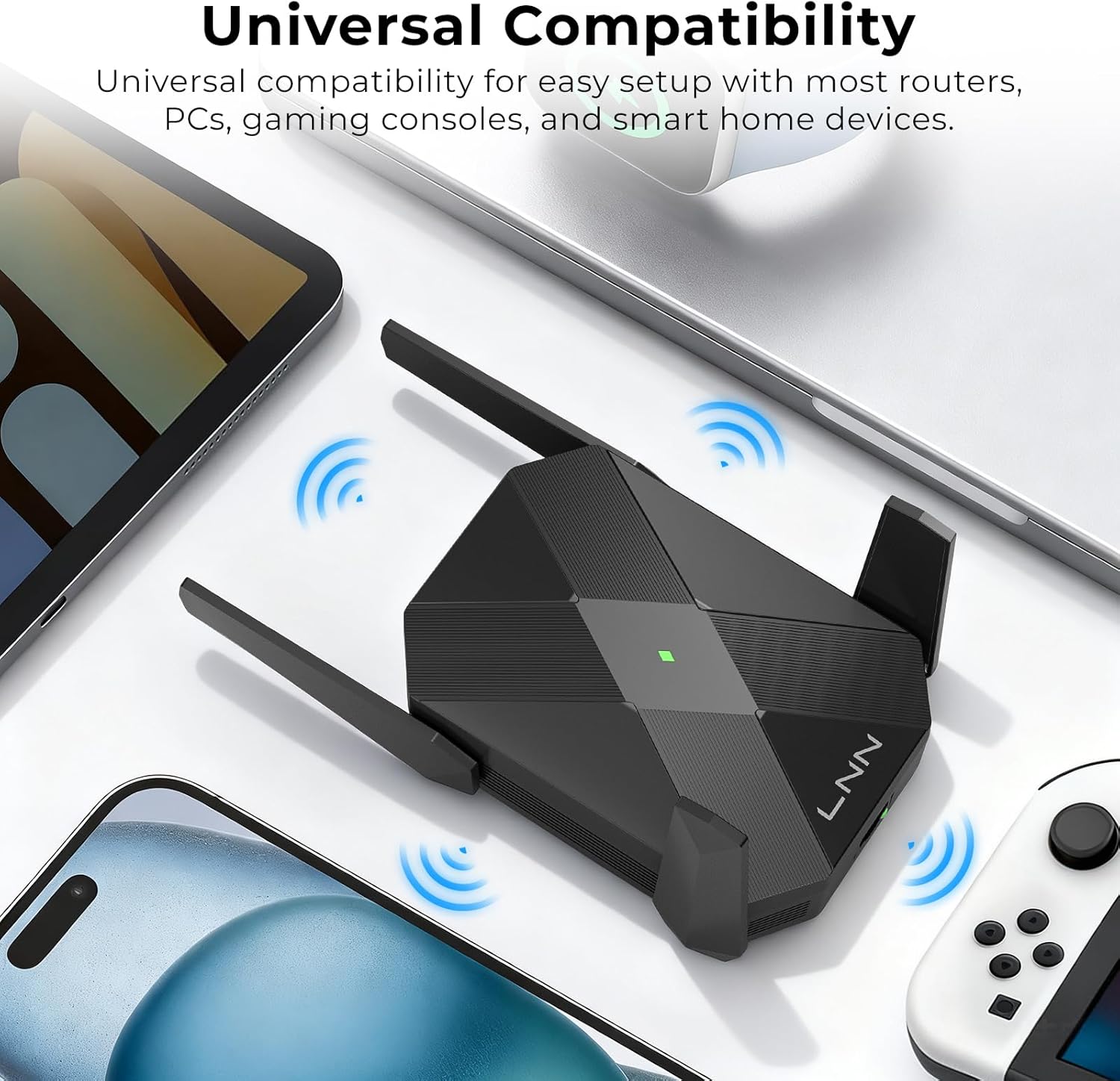 Boosted WiFi Coverage & Eliminate Dead Zones Equipped with 4 high-gain antennas, the LNN AX1800 WiFi Extender strengthens your router’s signal to cover areas with weak WiFi and eliminate dead zones. For optimal performance, plug the extender halfway between your router and the weak signal area. Ideal for large homes, offices, and multi-story spaces. Please note that all wireless extenders are designed to increase or improve WiFi coverage, not to directly increase speed.