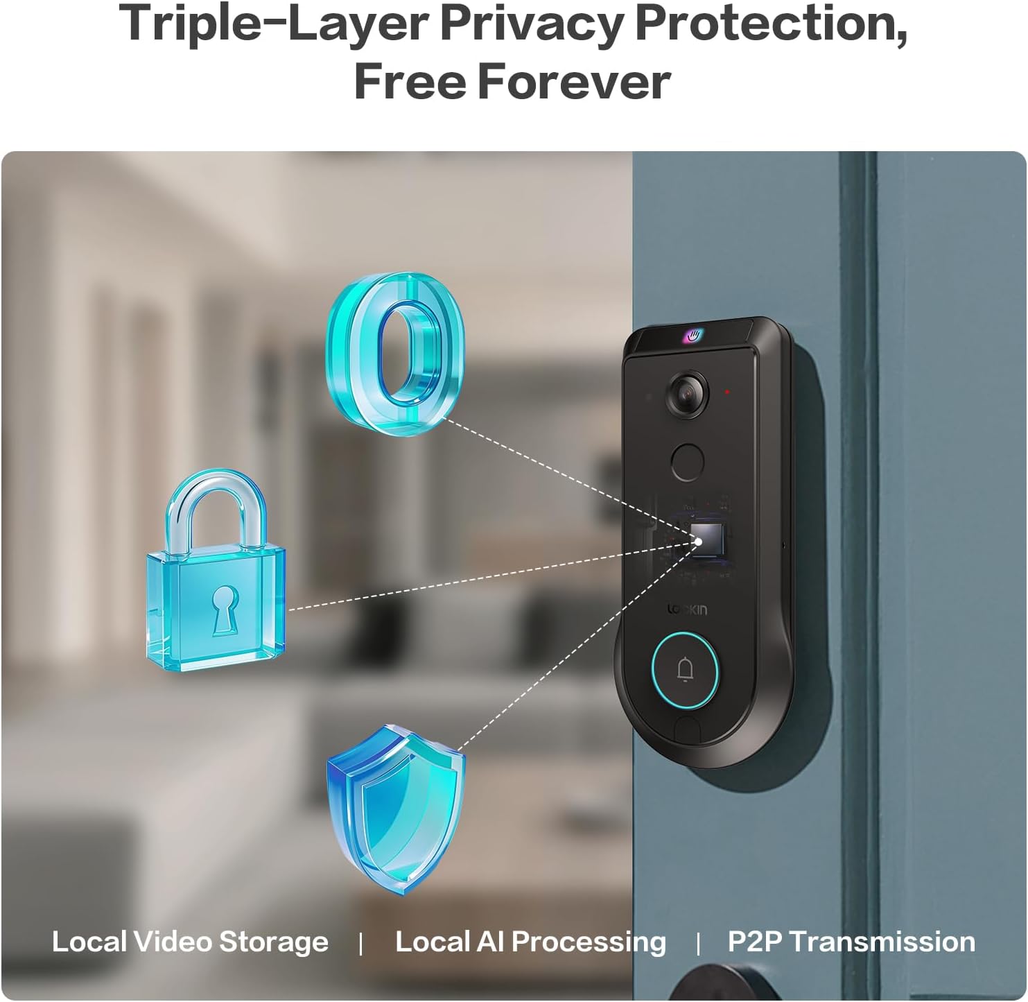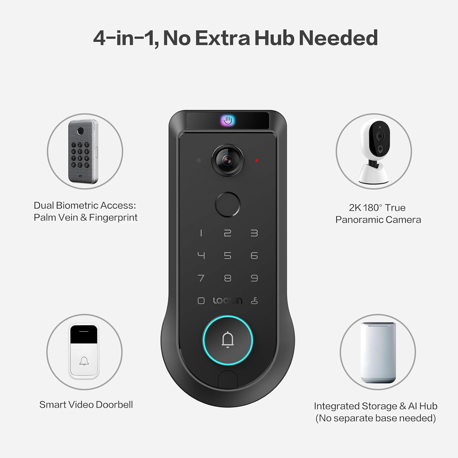 [4-in-1, No Separate Base Required] Seamlessly combines palm vein & fingerprint smart lock, crystal-clear 2K 180° true panoramic camera, smart video doorbell with night vision, and built-in AI hub with 32GB local storage, no extra hub needed, no monthly fee.