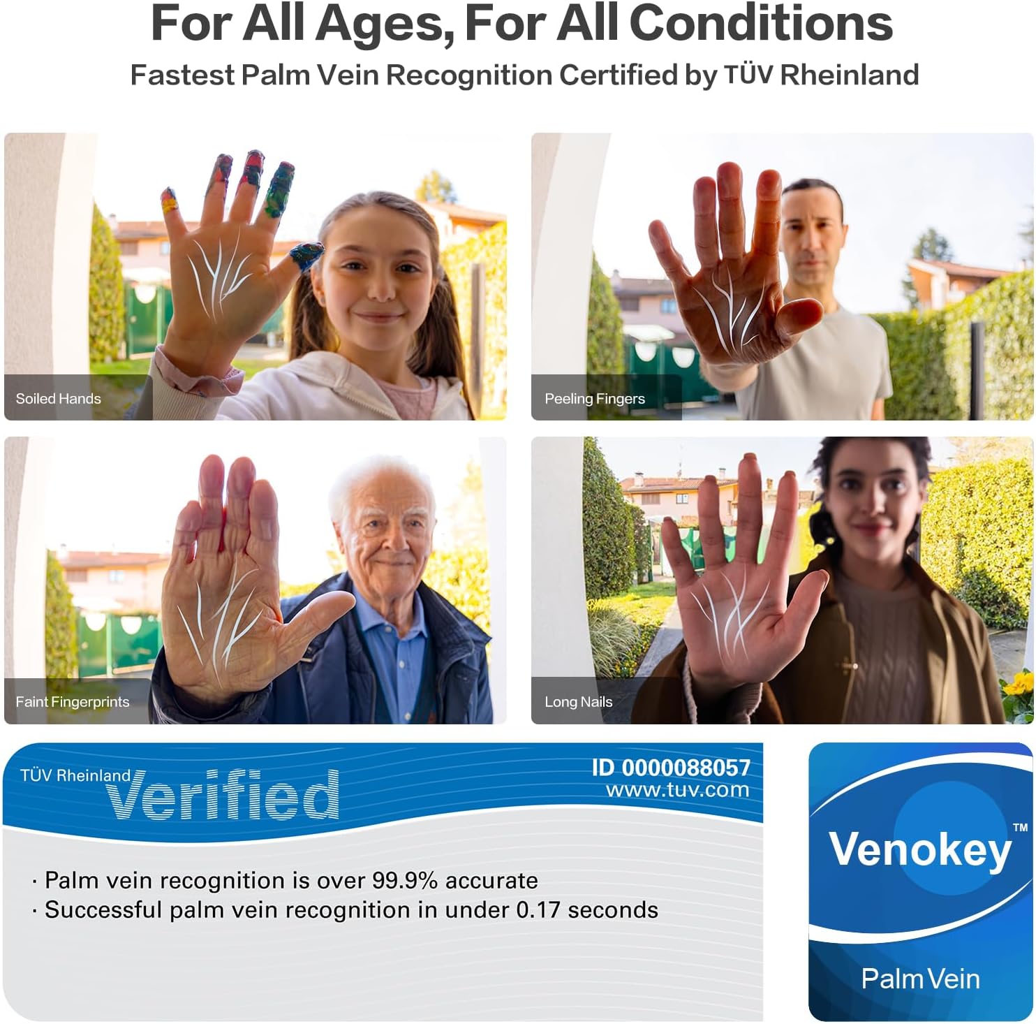 [Venokey Palm Vein Recognition, Universal Access for Everyone] Touchless palm vein unlock, TÜV Rheinland certified 0.17s recognition speed & 99.9% accuracy, works flawlessly with messy hands, peeling fingers, faint fingerprints, and long nails. FAR (False Acceptance Rate) <0.00001%, never compromise security.