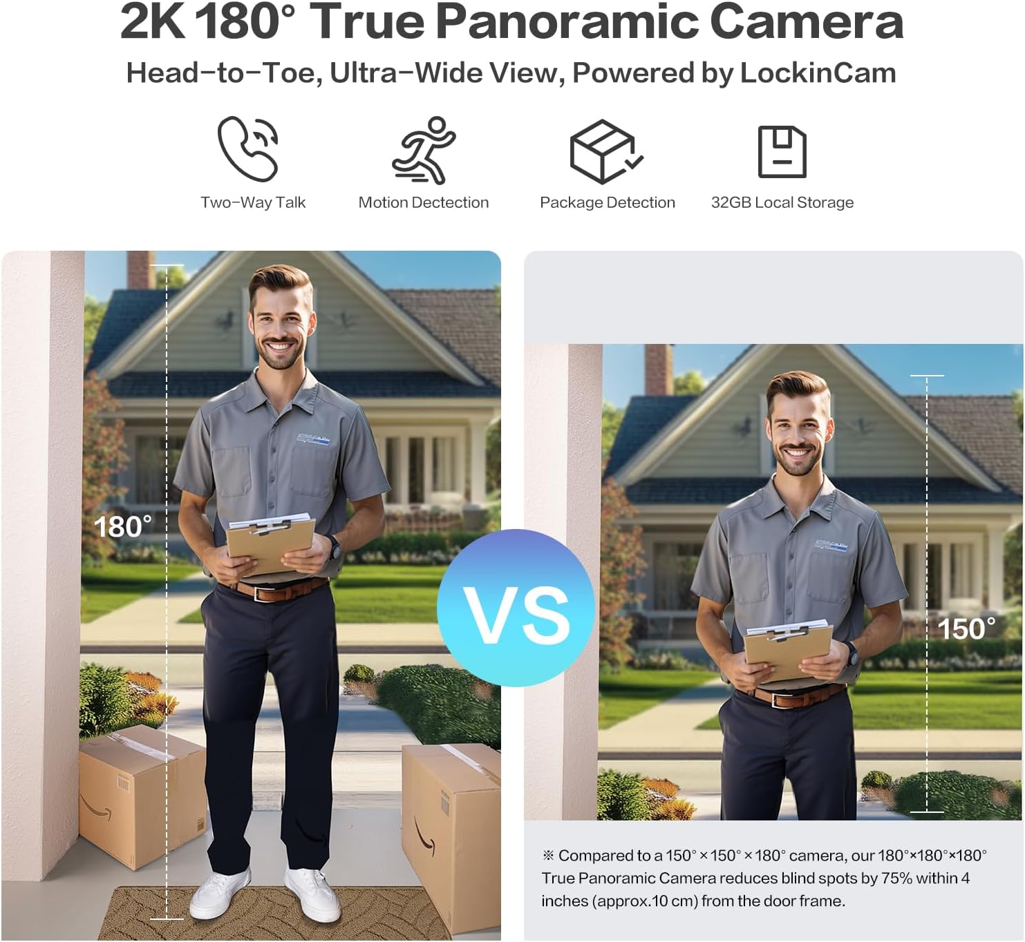 [LockinCam 2K 180°x180°x180° True Panoramic Camera] Compared to a 150°x150°x180° camera, our revolutionary 180°×180°×180° camera reduces bind spots by 75% within 4 inches (approx.10cm) from the door frame, providing head-to-toe, ultra-wide views at your doorstep. Veno Pro features local AI motion detection, IR night vision, two-way talk, and 32GB built-in storage, no monthly fees, ever.