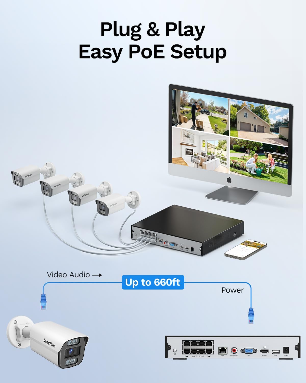 ✅【Design for Outdoor/ 32 Users Access】- Featuring a durable metal body, you can holds up Longplus NVR camera system to a range of extreme weather conditions without missing a beat making it ideal for both indoor and outdoor surveillance. You can access live footage remotely via Longvision app compatible with iOS, Mac, Windows, and Android and share the video with other 31 users (Support 32 users) to enjoy the peace of mind.