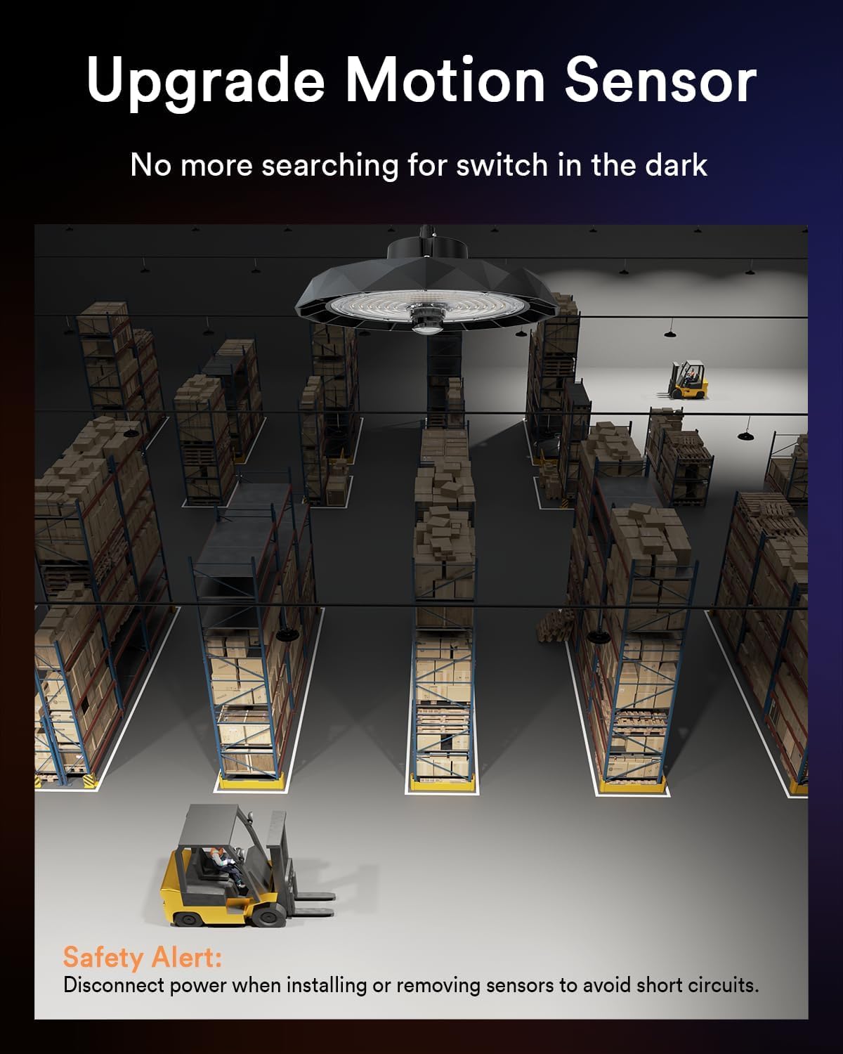 Smarter Motion Sensor: 3-Level Motion Sensing: Low, Medium, High. The motion dectections are adjustable and check again easily as they can be recorded on your phone when you have linked to hub. Enhances garage security & save energy and times, without having to manually flip a switch. With wide sensing angle, it senses motion up to max 60 feet away and the lighting time can be adjusted from 5 seconds to 60 minutes. If RADAR detector is too sensitivity, use metal tape to cover the whole sensor. Recommended hanging height: Over 12ft. Safety Alert: Disconnect power when installing or removing sensors to avoid short circuits