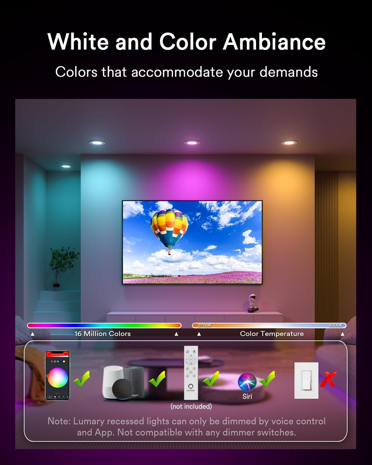 Multiple Control Ways: There is more than one way to control 3 inch Lumary smart recessed lighting, including Lumary APP, Alexa, Google Assistant, Siri(Not support Homekit, achieve Siri control through Lumary App automation function), and BT remote control (sold separately), which can easy to achieve long-distance remote control. (All of our smart lights are NOT work with any dimmer switch! )