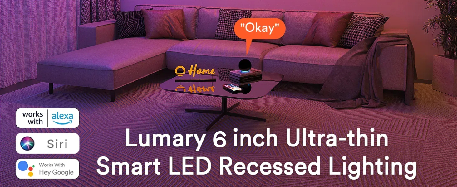 【Smart Recessed Lighting – Voice / Remote Controller】Lumary 6 inch smart WiFi recessed lights works with Alexa and Google Assistant or Remote Controller, no hub required. Free your hands with simple dialogs/buttons to turn on or off smart LED recessed lighting, change colors, and adjust brightness.