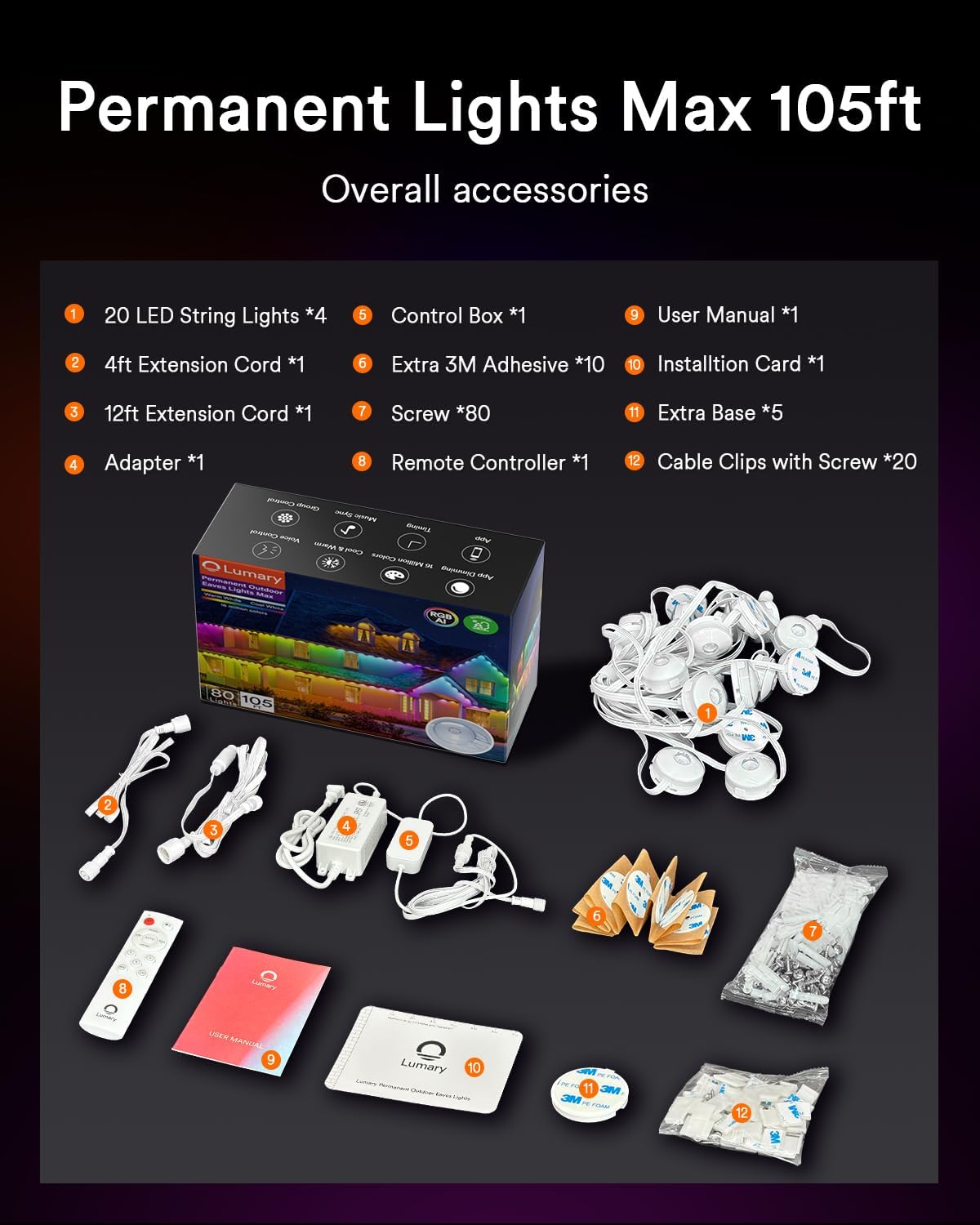 Multiple Control Methods: Manage your permanent holiday lights effortlessly through the Lumary App (2.4G WiFi only), Alexa, Google Assistant, or the convenient control box. A great choice for smart home integration and year-round outdoor lighting