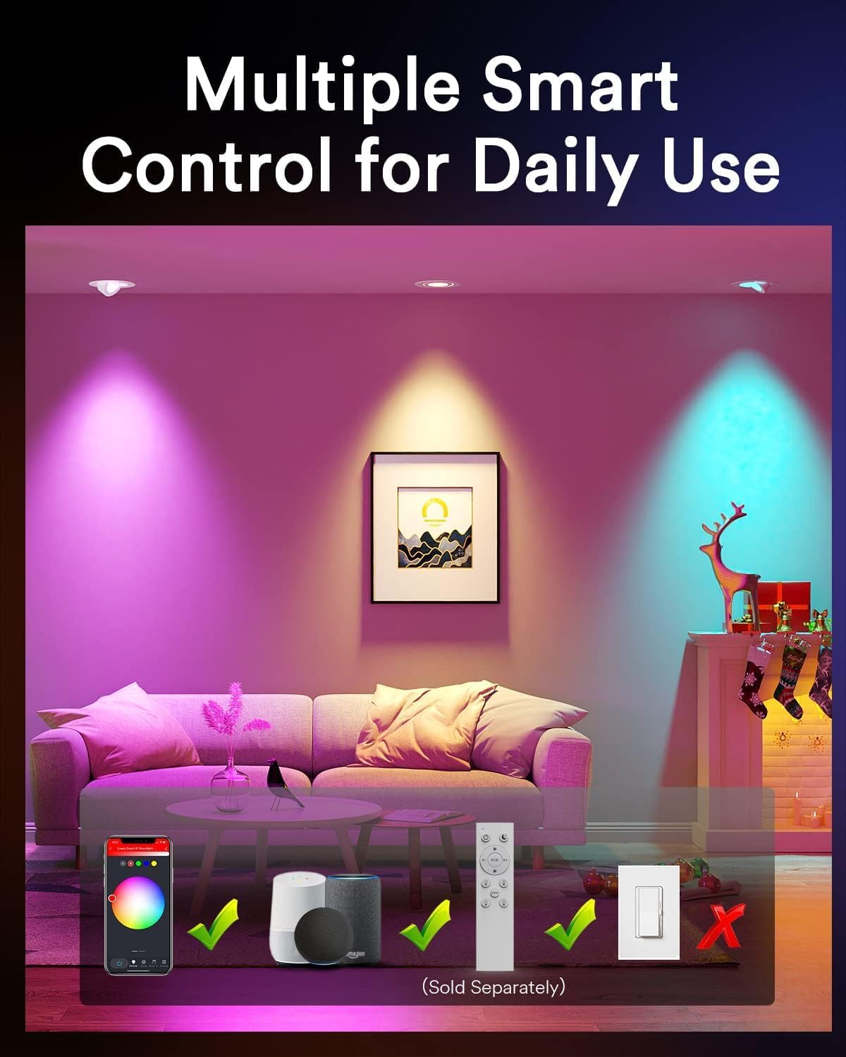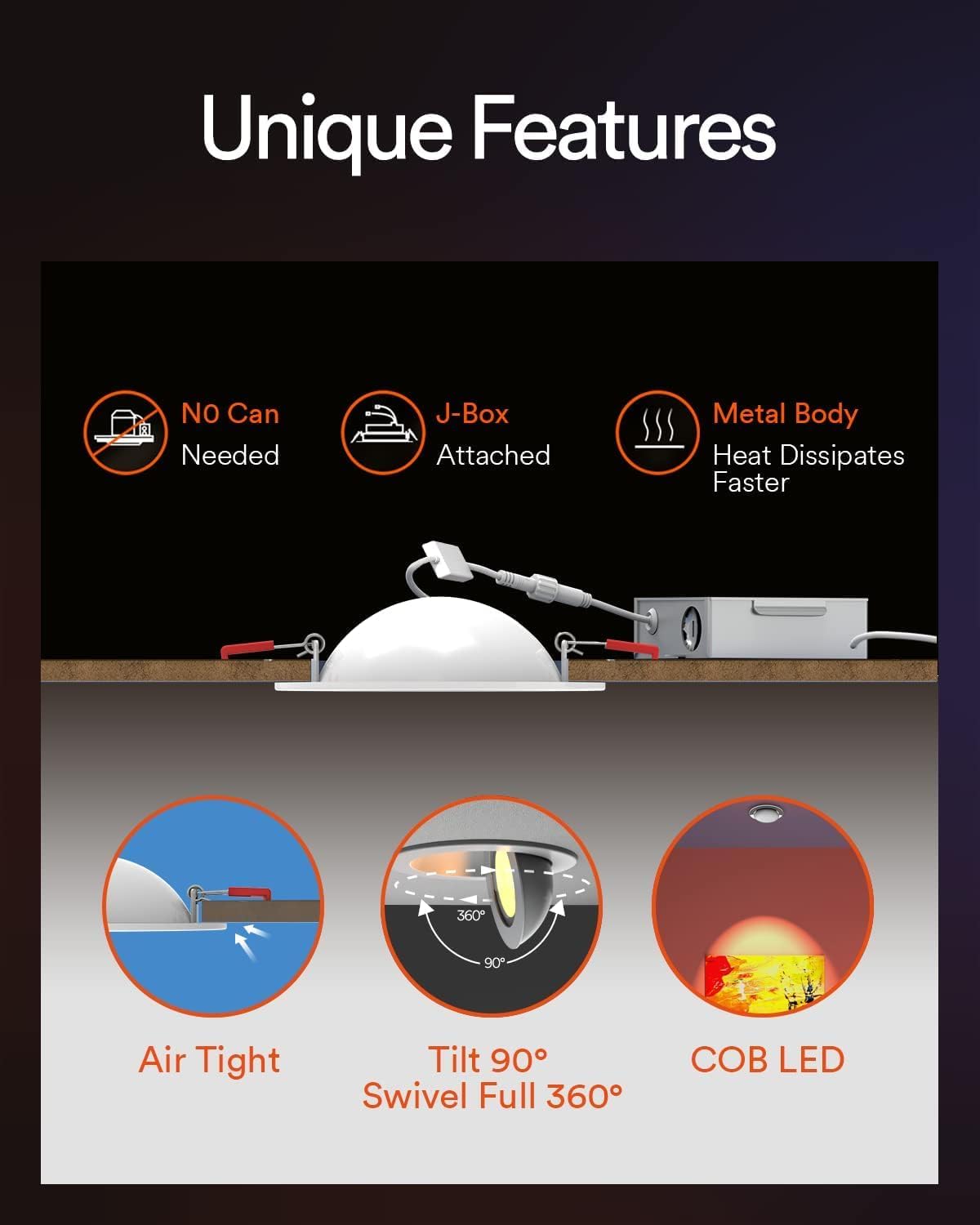 White Options & RGB Selection – The can light is versatile, offering adjustable color temperatures from 2700K to 6500K and accessing to 16 million RGB colors, this canless smart recessed lighting 4 inch allows you to customize your lighting to suit any occasion or interior design
