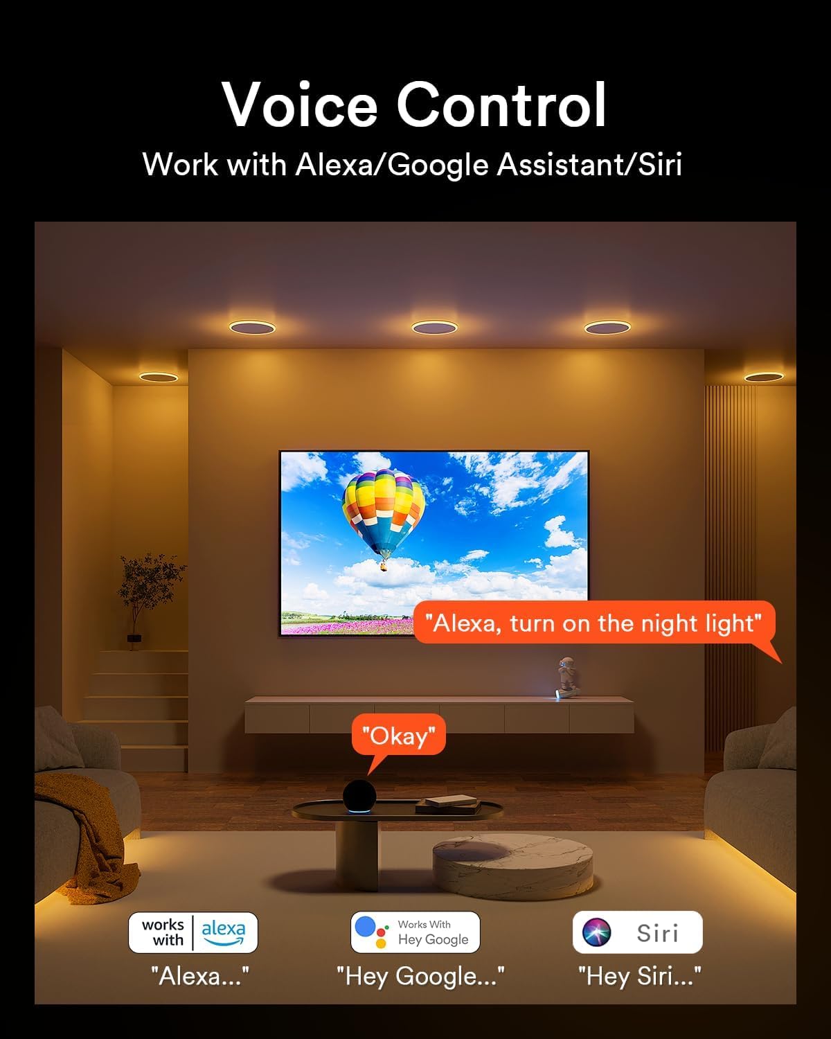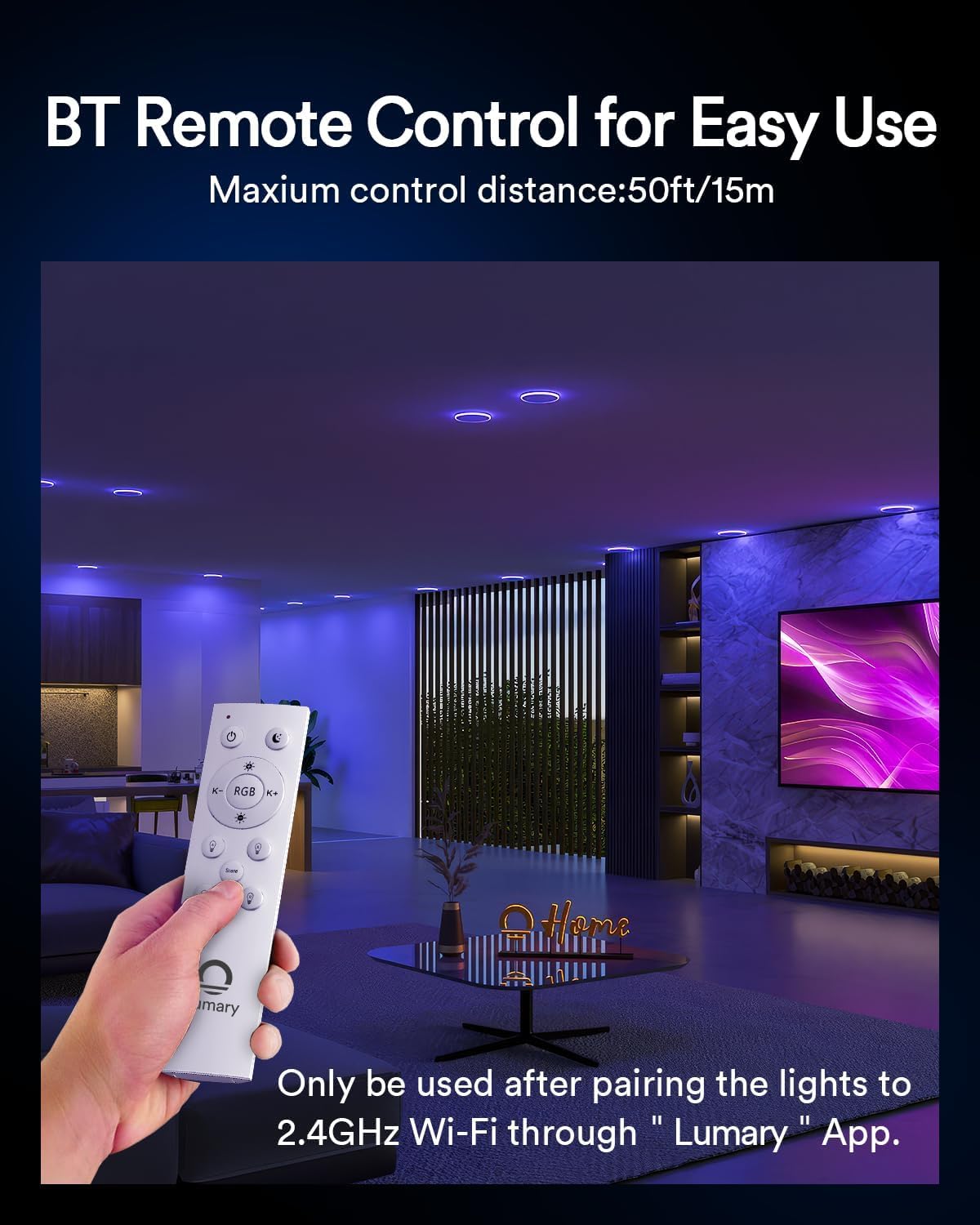 【Voice / BT Remote Control】Lumary 4 inch smart wifi recessed lights work with Alexa and Google Assistant or BT Remote Control. Make your life easier by using simple dialogs/buttons to turn the Lumary canless recessed lighting 4 inch on or off, change the color, and adjust the brightness