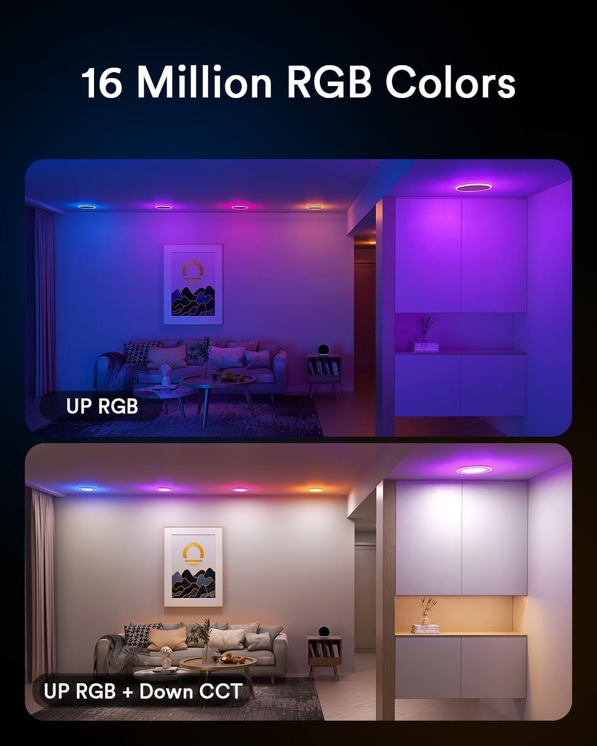 【Colorful Palette】 Lumary smart LED recessed lighting with RGB back light mode allows you to adjust the color of the light as you wish. Smart recessed lighting 4 inch can create 16 million colors and 14+ scene modes to create a variety of colorful color combinations for unique lighting effects. HIGHLIGHT: Uplight-RGB/Downlight-CCT can be illuminated at the same time or used individually