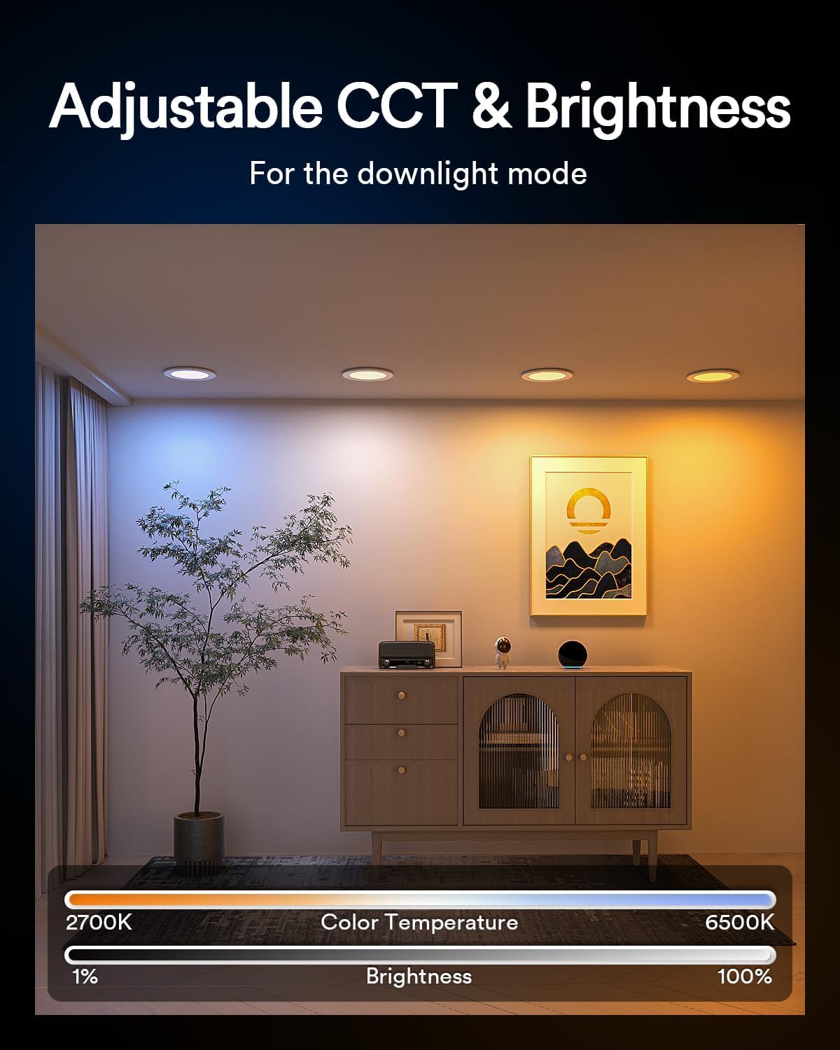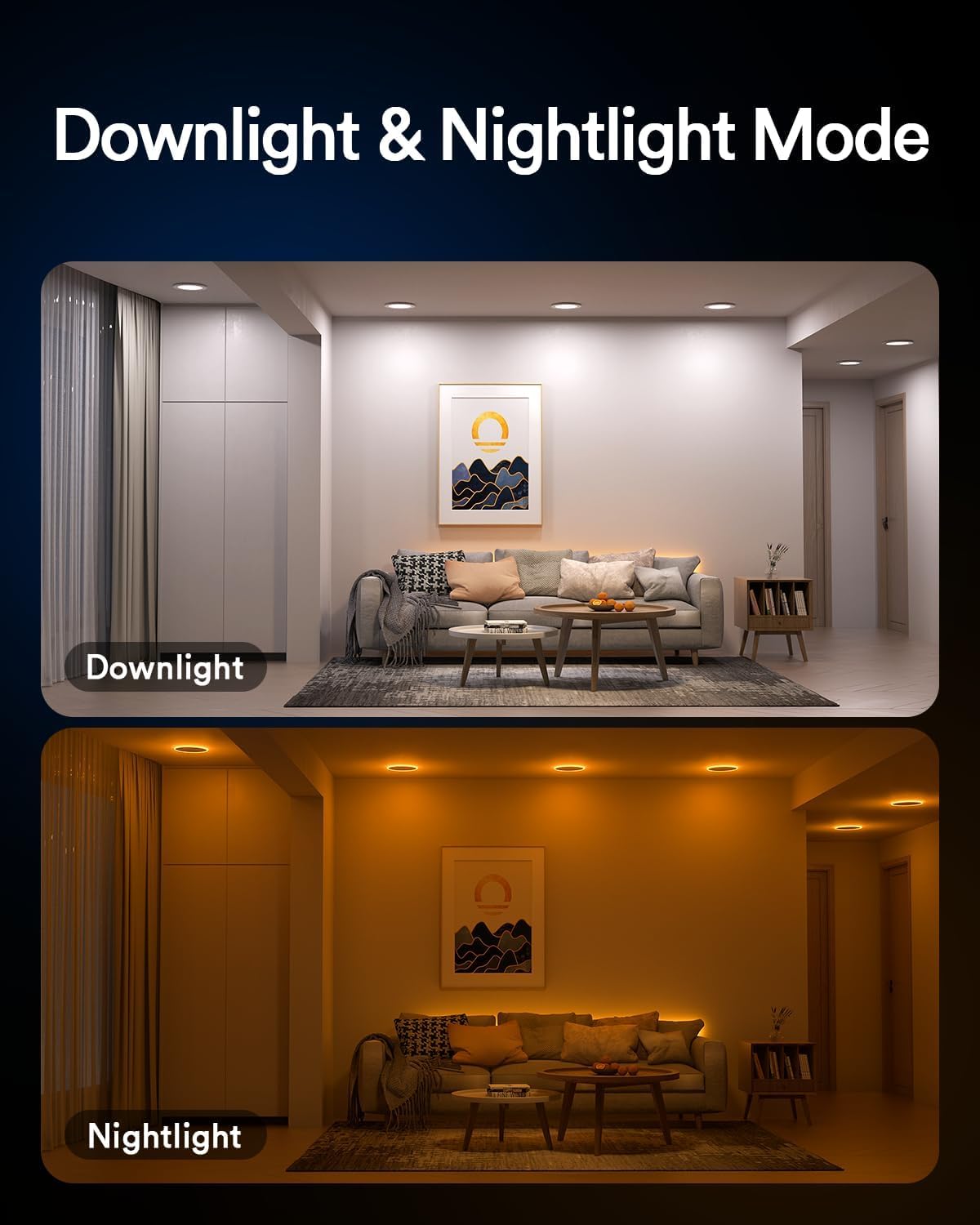 【2700-6500K Adjustable and Brightness】Lumary smart recessed lights 4 inch with night Light support 1%-100% brightness adjustment and offer warm and cool whites from 2700K to 6500K. Adjust the color temperature and brightness of the light according to different activities, from soft reading light to bright work light, and adjust the lighting environment more freely for better comfort and adaptability. ( All Lumary smart lights do NOT work with a dimmer switch! )