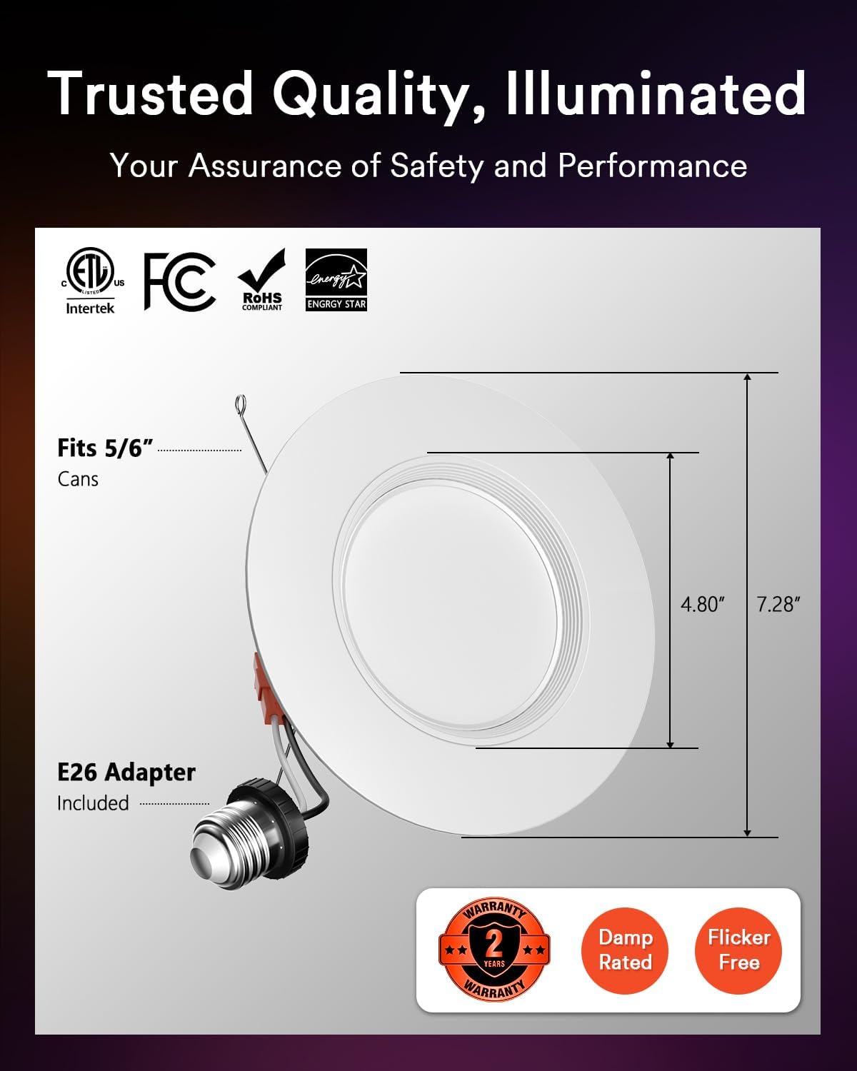 Trusted Performance: Designed with safety and reliability in mind, Lumary retrofit led recessed lighting 6 inch is air-tight and IC Rated, making it suitable for contact with insulation and ideal for damp locations. ETL listed for quality assurance, this LED can ceiling light provides peace of mind and long-lasting performance in various indoor settings