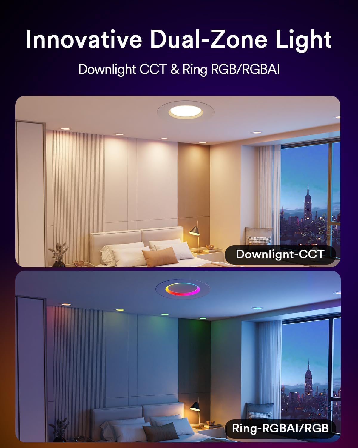 Effortless Smart Home Automation: Manage your smart recessed lighting effortlessly with Lumary APP, Alexa, or Google Assistant. A simple tap or voice command lets you instantly tune the lights. Set your Lumary lights to intuitively follow your daily routines, including scheduling sleep and wake-up times, with our easy programming feature. Revel in personalized comfort, as your lighting remembers your preferences for every occasion—weekday productivity or relaxation. They are packed with features and make a great addition for a truly customized smart home lighting experience. NOTE: After ”Bedroom” synced to Alexa, they named Bedroom and Bedroom Colorswitch!!