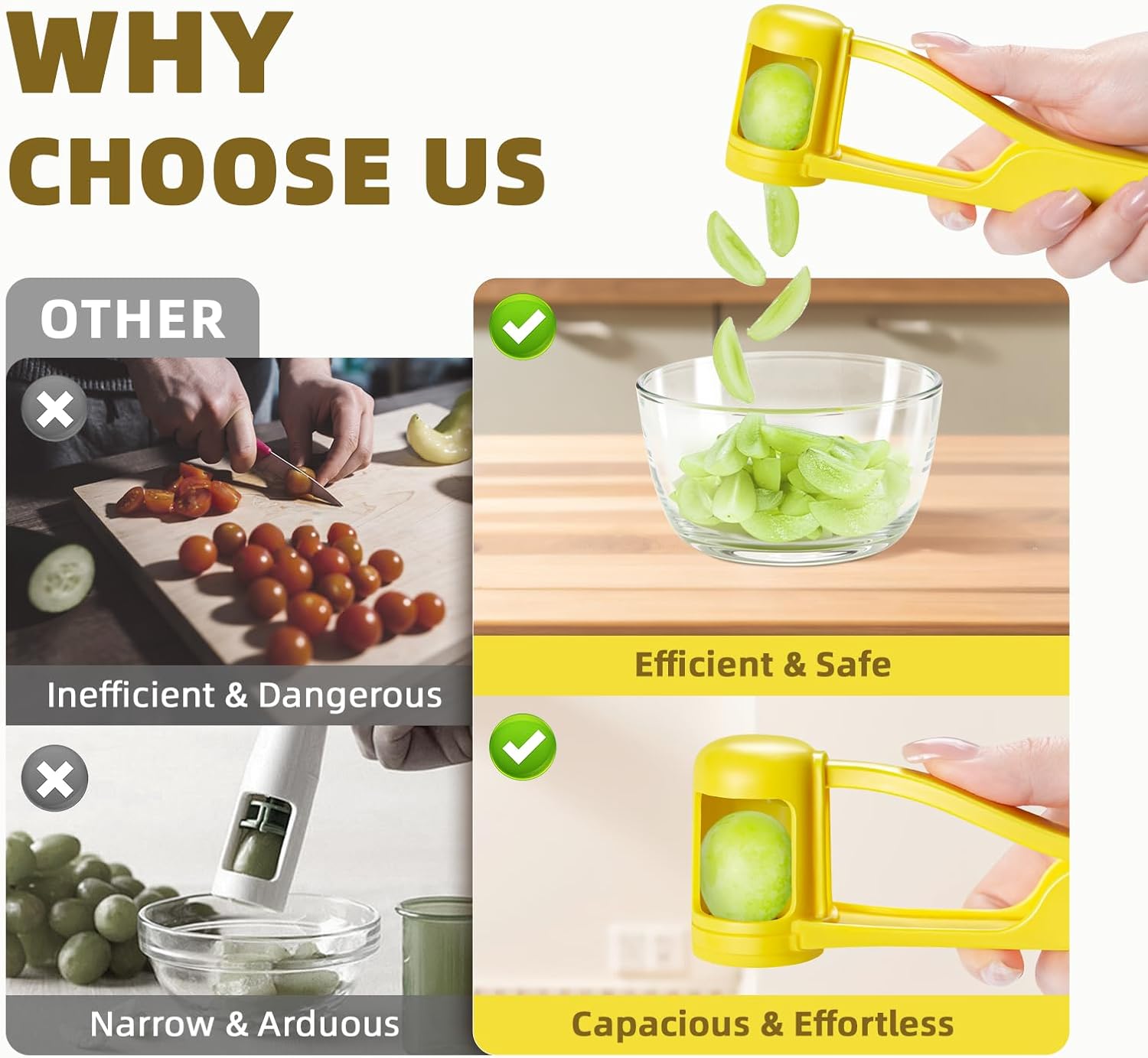 【Effortless Fruit Cutting】This grape cutter features a unique patented design that allows you to effortlessly slice fruits into four pieces with just a gentle press of your thumb. Its automatic spring-back mechanism makes single-handed operation effortless, requiring no force, and prevents fatigue even during continuous cutting, greatly enhancing kitchen efficiency.
