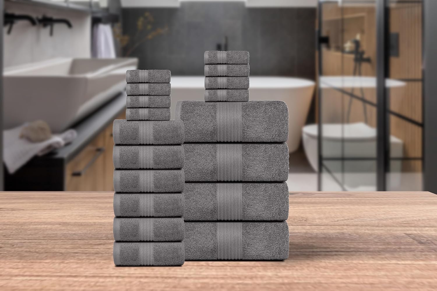 VERSATILE SET FOR FULL FAMILY USE: This comprehensive towel set is designed to provide convenience and style for the entire family. With a generous count of 18 pieces, it ensures you have ample towels at hand, whether for personal use, guest bathrooms, or as a thoughtful housewarming gift. The variety in sizes – bath towels for full-body drying, hand towels for quick access, and washcloths for facial care – makes this set a versatile choice for any home.