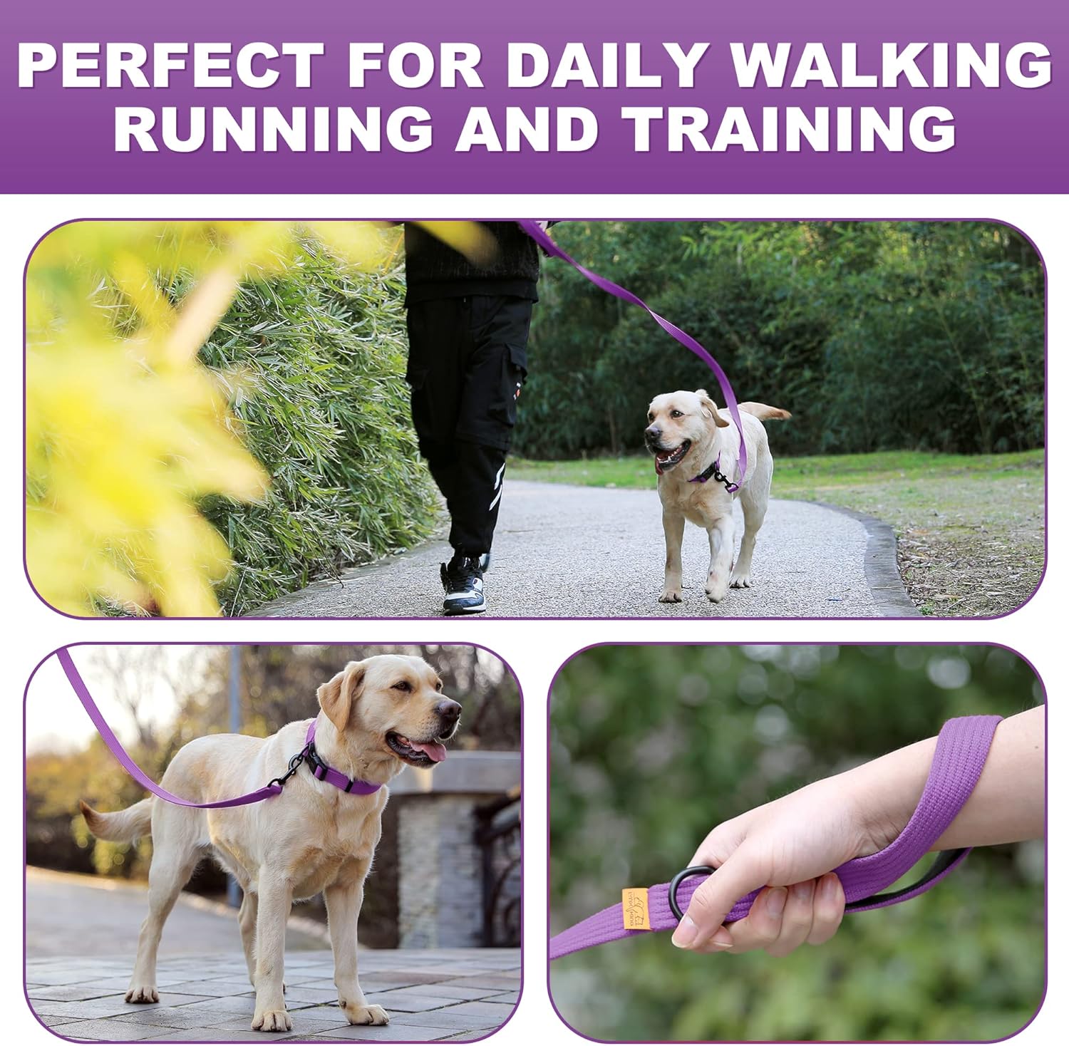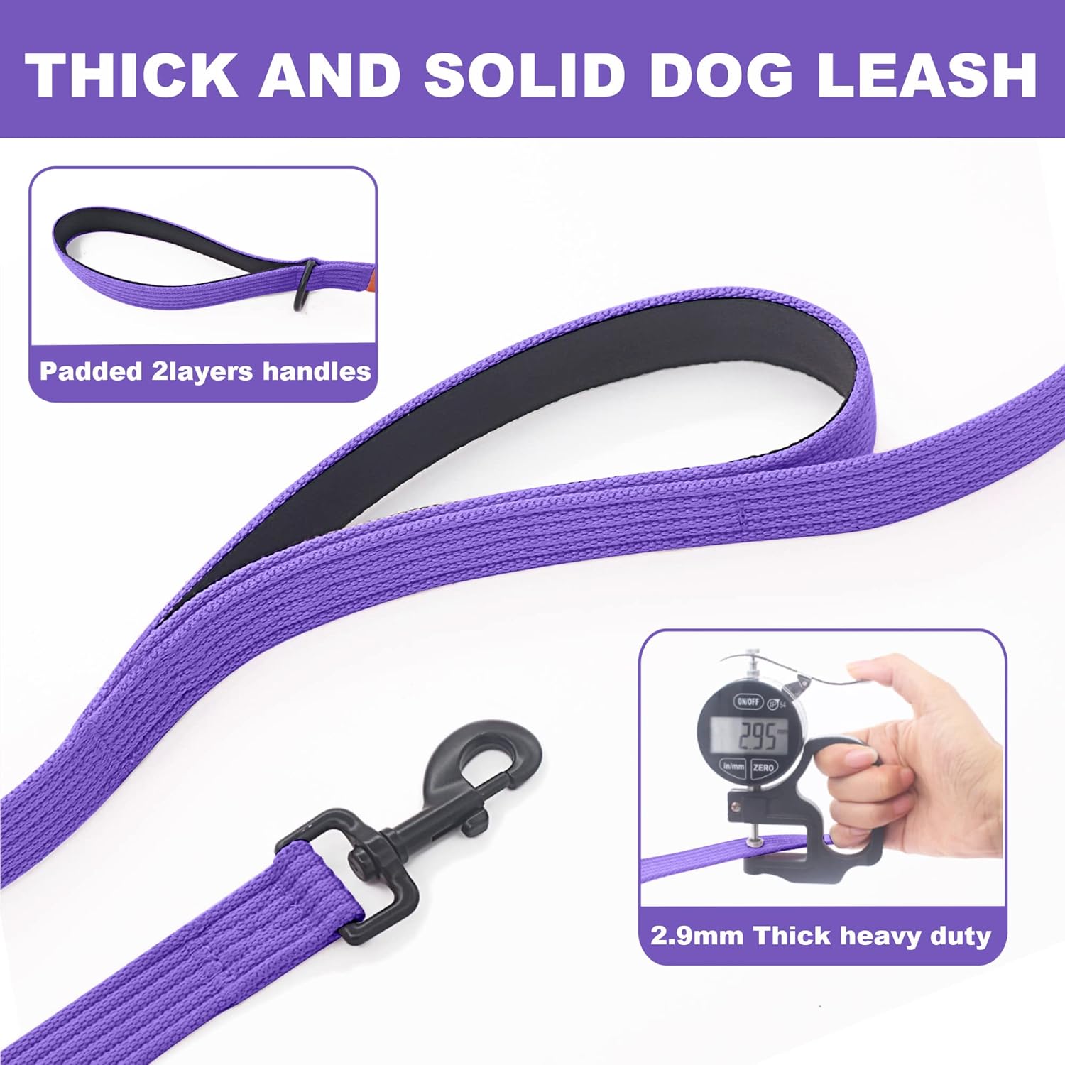 Two Handles Dog Leash: Our 2 padded handles leash is specially designed with 2 handles,one at the end at 6ft and the other 2ft from the clip. All the 2 handles have soft padded lining for comfortable grasp. Use the handle at the end for casual daily walks,extended sniffing;use the handle 2ft from the clip for instant,up-close control when walking your dog through sidewalk or crowded areas. Double handle leash enables you to switch at will between freedom and control.