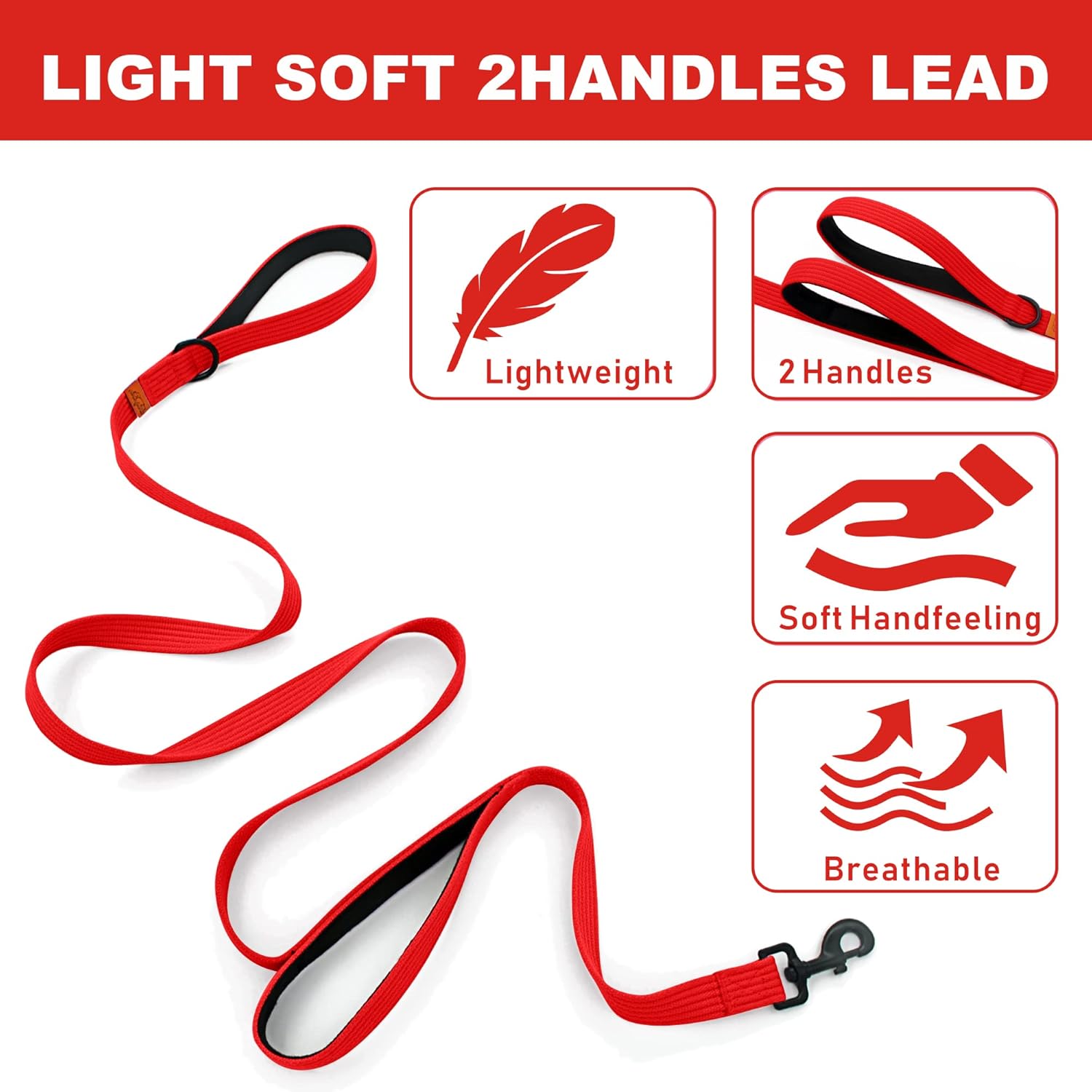 Two Handles Dog Leash: Our 2 padded handles leash is specially designed with 2 handles,one at the end at 6ft and the other 2ft from the clip. All the 2 handles have soft padded lining for comfortable grasp. Use the handle at the end for casual daily walks,extended sniffing;use the handle 2ft from the clip for instant,up-close control when walking your dog through sidewalk or crowded areas. Double handle leash enables you to switch at will between freedom and control.