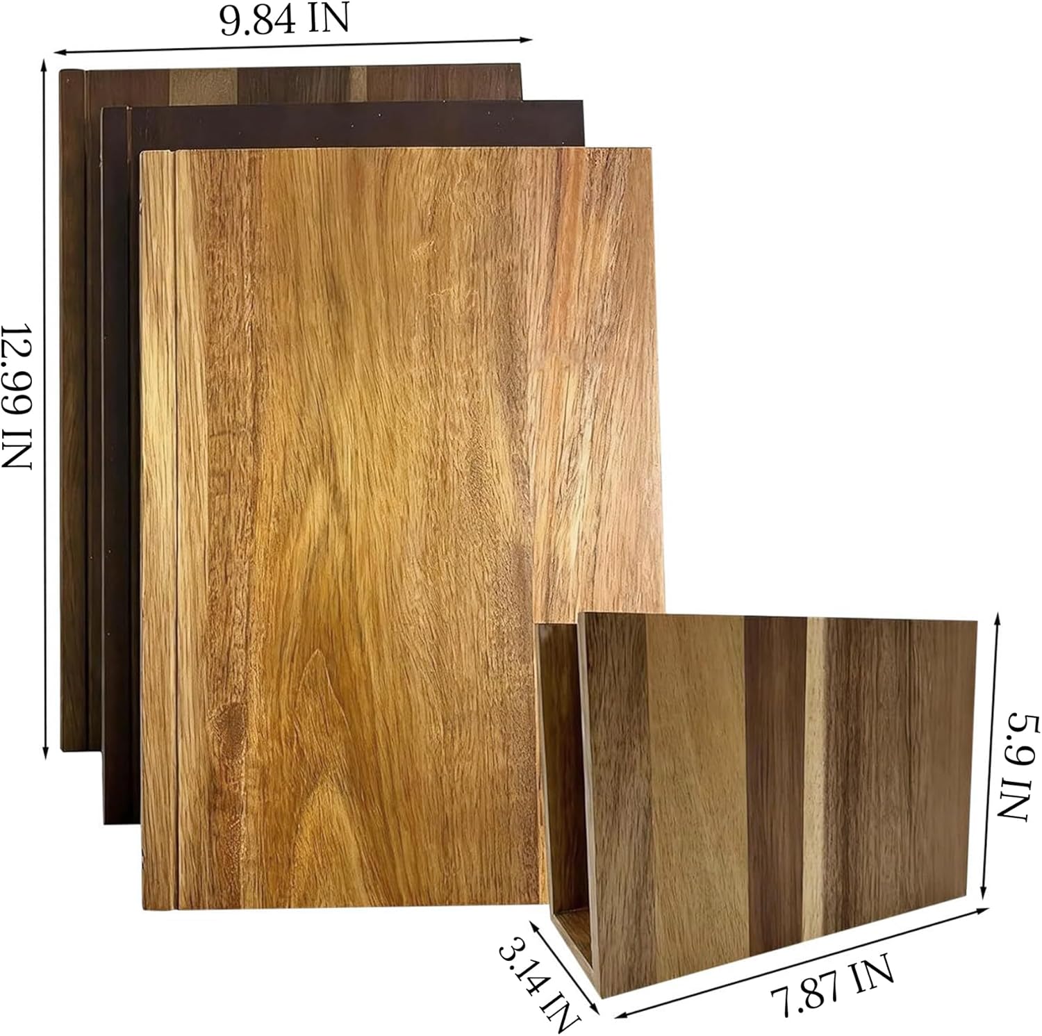 With Wooden Stand: Comes with a sturdy wooden stand that promotes natural air-drying of the boards. It also allows for convenient storage and attractive display. The stand itself serves as a decorative piece, enhancing both the organization and overall aesthetic of your kitchen