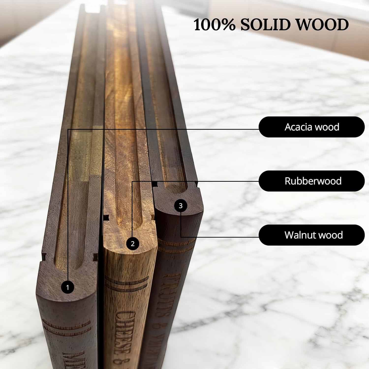 Material: This book shaped cutting board set is crafted from natural acacia wood, rubberwood, and walnut, offering long-lasting durability. It seamlessly combines functionality with aesthetics, making it a practical and stylish kitchen essential