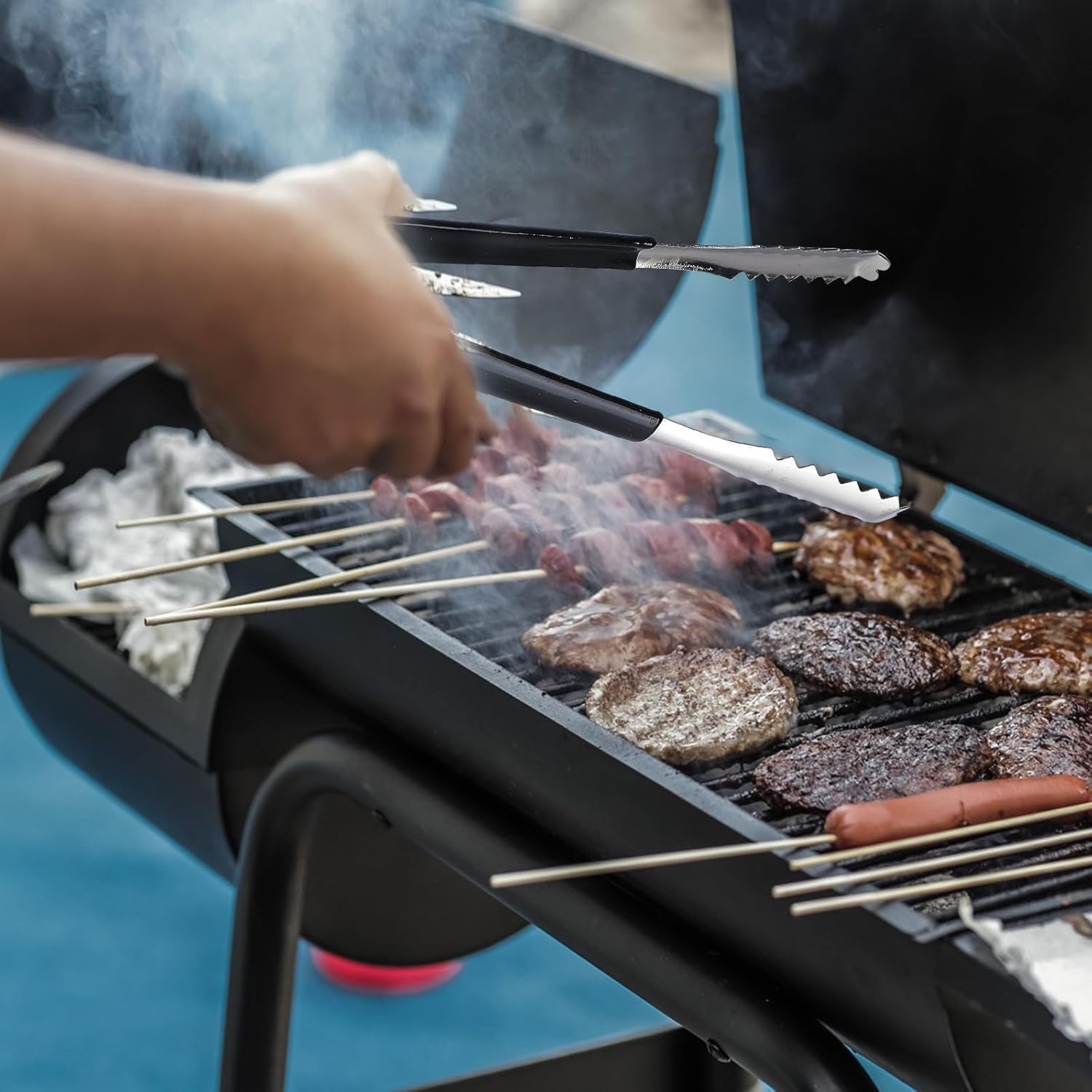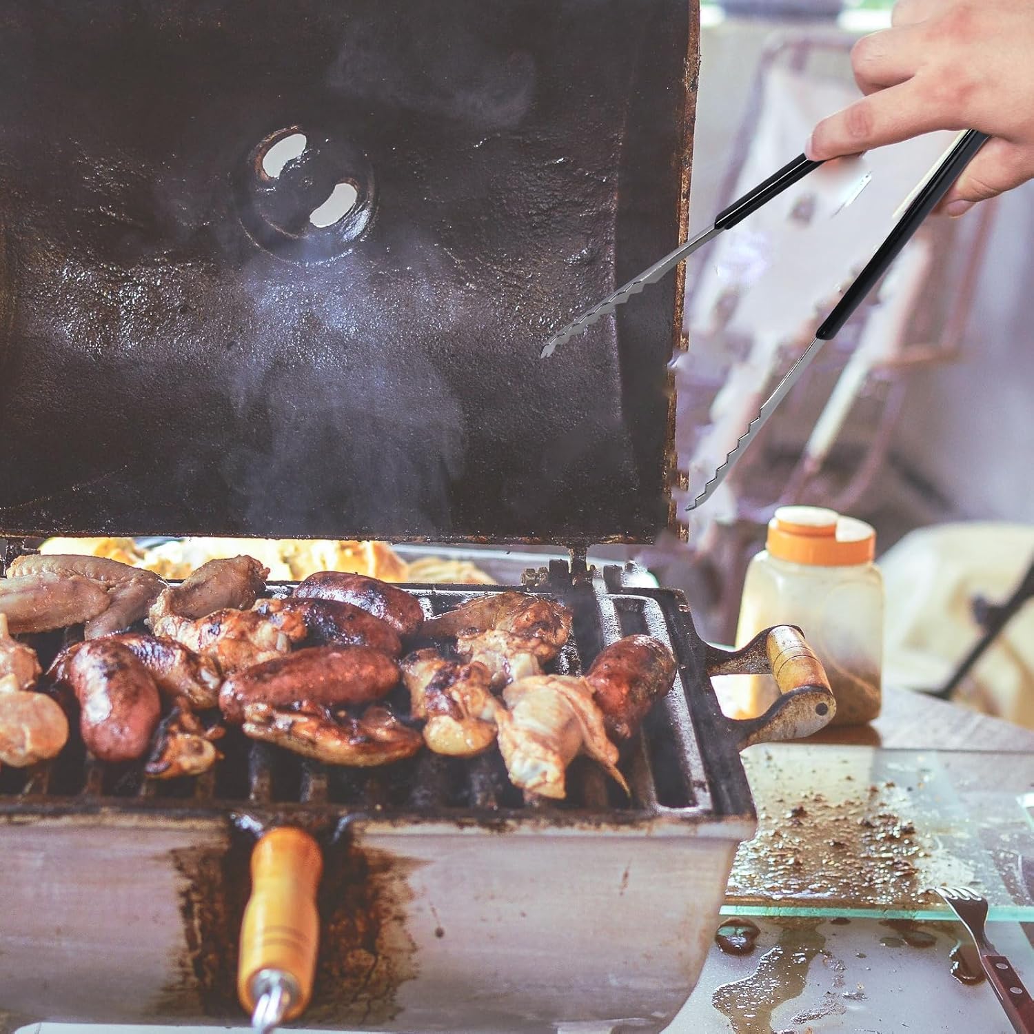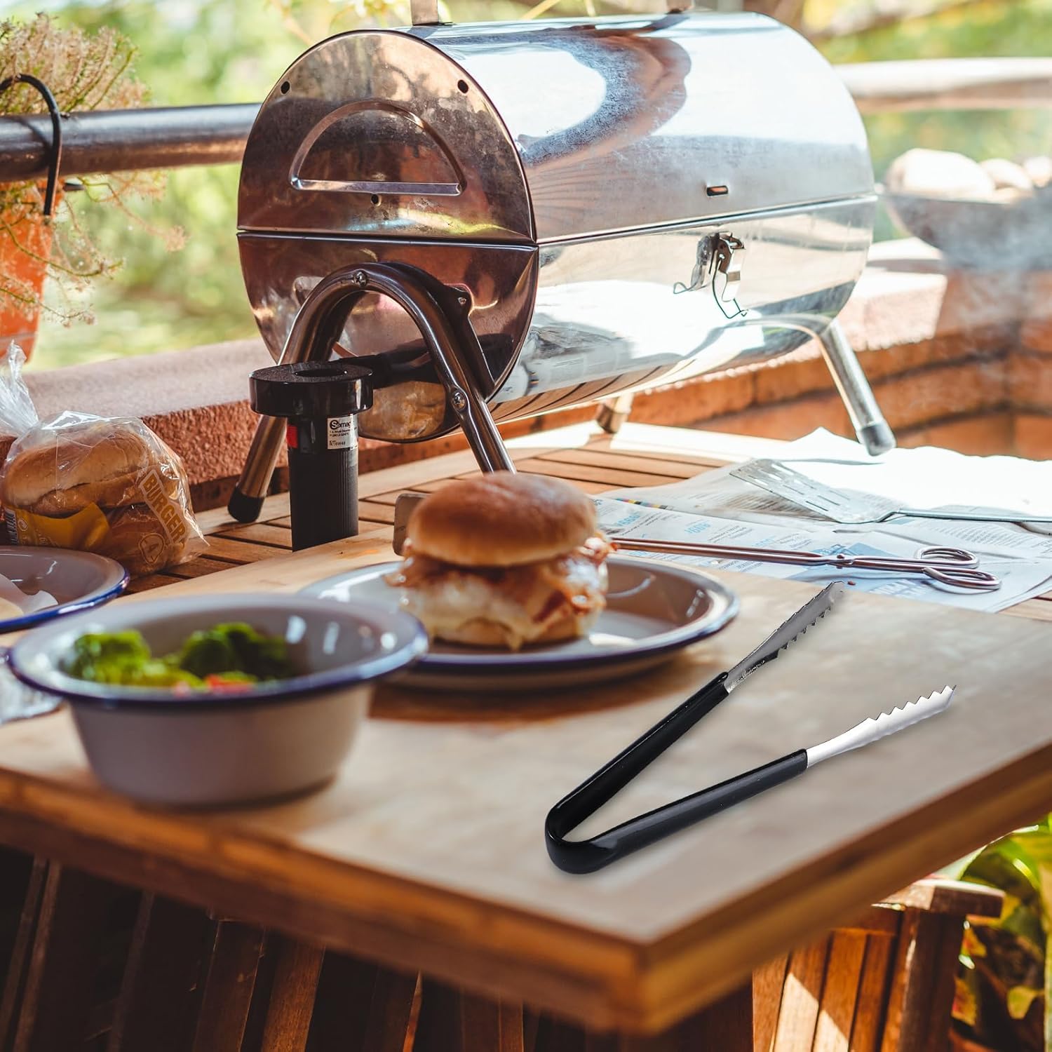 – Color: Black and silver Stainless steel tongs.