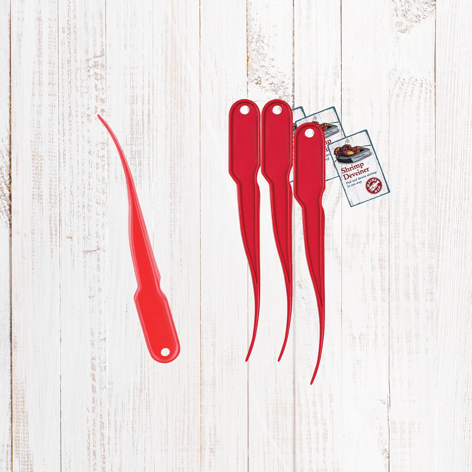Maine Man’s set of 4 Shrimp Deveiners makes it easy to clean and devein shrimp, and remove the shells in a single action. Easily clean shrimp and liberate every delicious bite in just seconds. It’s a helpful addition to cooking tools for making shrimp recipes faster and easier, like peel and eat shrimp, shrimp scampi, kabobs for grilling, shrimp salad, and so much more. Easy to use. Simply slip the tapered end under the shell and push it along the shrimp’s back. Pull upward to remove the shell and vein at the same time. Make sure to rinse the shrimp well in cold water. For best results, thaw shrimp fully before attempting to clean it, but keep it well chilled. Made from food-safe plastic, The Shrimp Deveiner is durable and strong with a notched handle for secure grip. Compact enough to fit in a drawer with other kitchen gadgets or flatware. Top-rack dishwasher safe for easy cleanup. Brought to you by HIC-Harold Import Company.