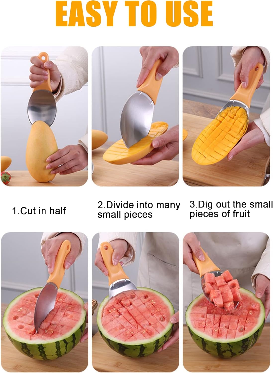 Multifunctional Use: Can cut a variety of fruits including mango, kiwi, watermelon, pitaya and avocado. It can cut into small or large pieces.