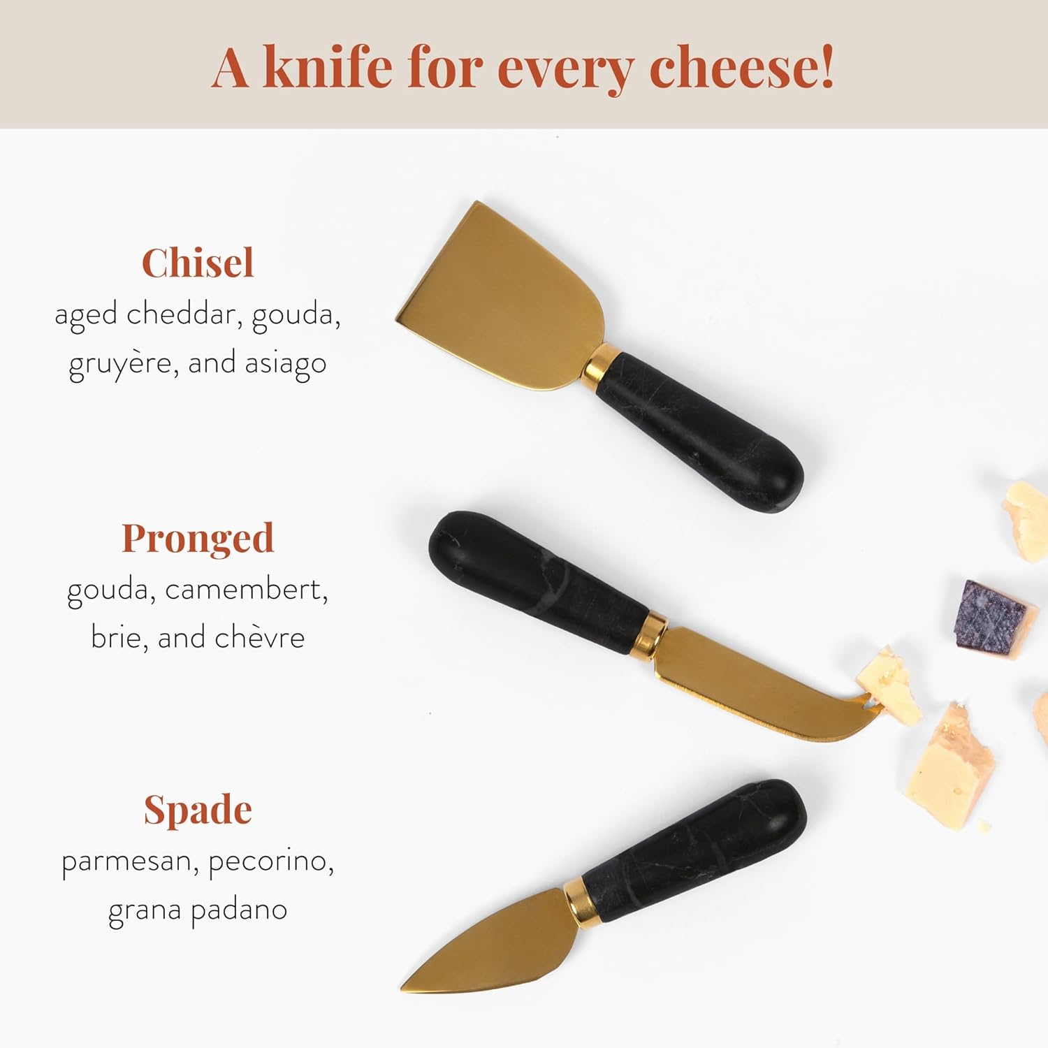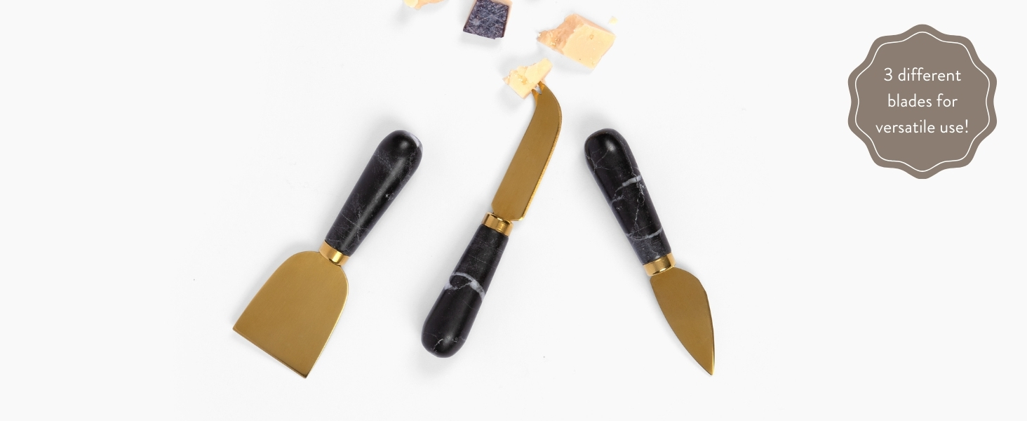 A CHEESE KNIFE FOR EVERY CHEESE: Our cheese knife set includes three versatile cheese knives, suitable to use with a variety of cheeses. From Cheddar to Brie, this charcuterie knife set is ideal for cutting, spreading, and serving.