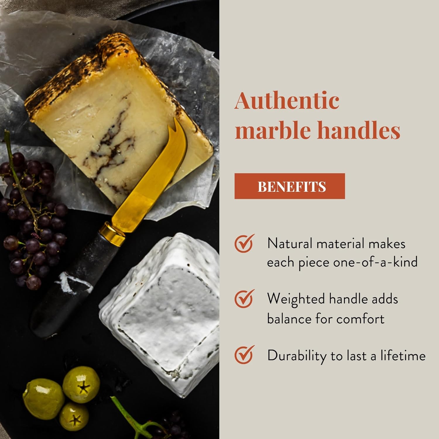 CRAFTED FROM PREMIUM MATERIALS: With authentic marble handles and titanium blades, these cheese spreader knives offer durability that lasts a lifetime. Elevate your charcuterie set with these exquisite cheese knives, ideal for any gathering.