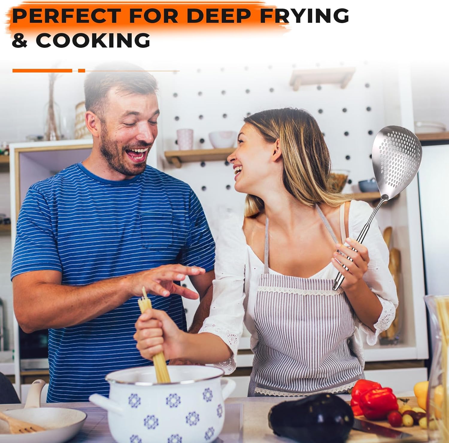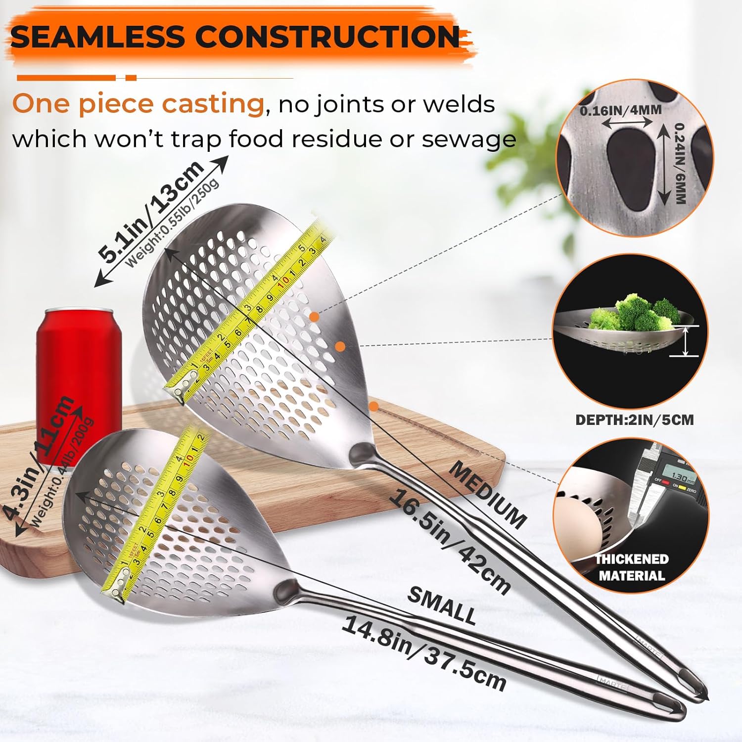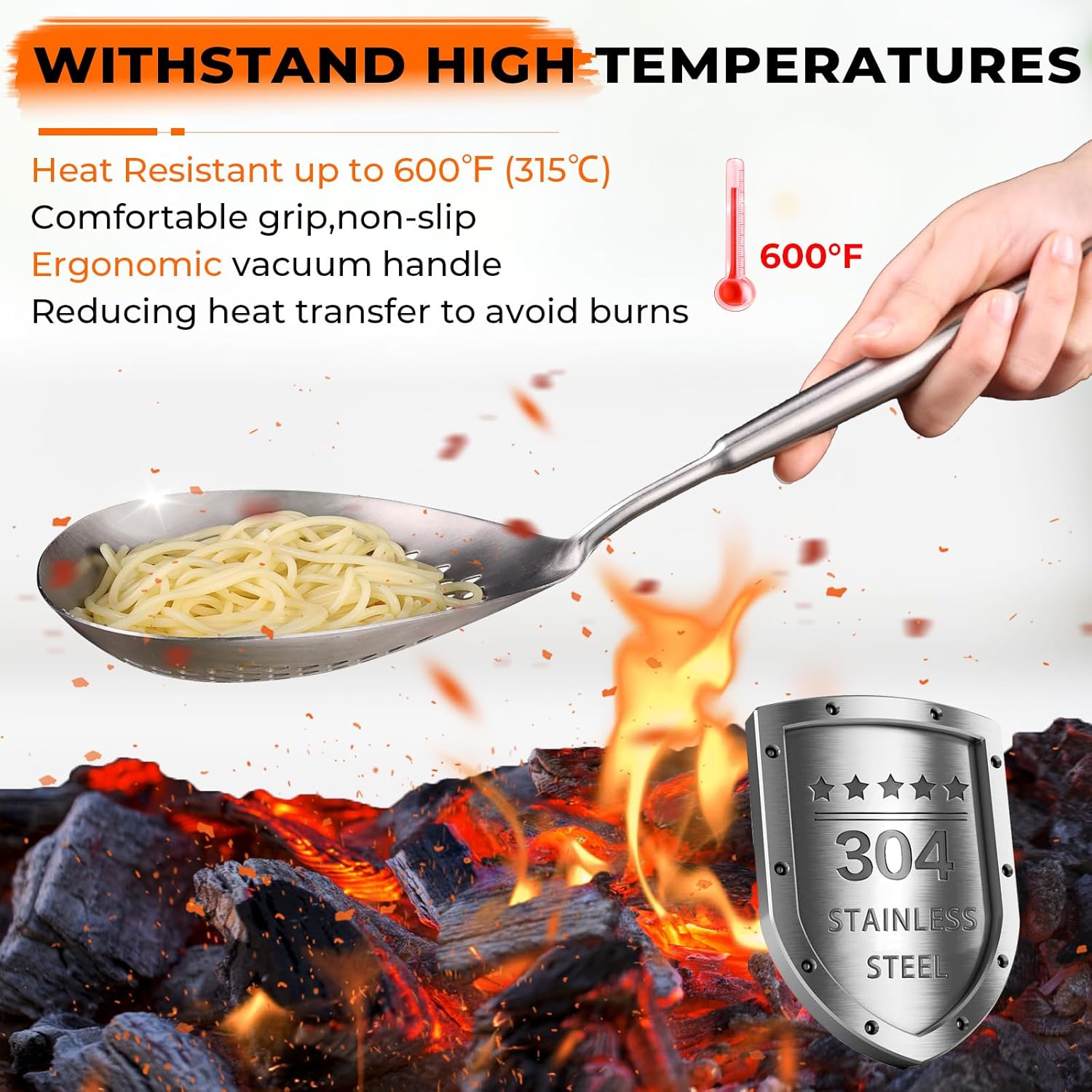 HIGH TEMPERATURE WITHSTAND: The metal cooking spoon can withstand high temperatures up to 600°F/315°C. The ergonomic long handle protects you from cooking fumes and splashing liquid droplets. The extra-large strainer bowl can help you scoop out a large amount of food quickly within a few seconds. It will be widely used in your kitchen and is an indispensable item in the process of cooking and frying food at home or in professional commercial kitchen