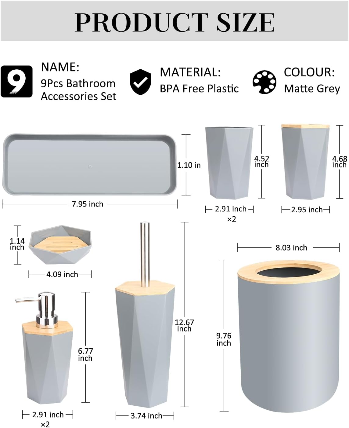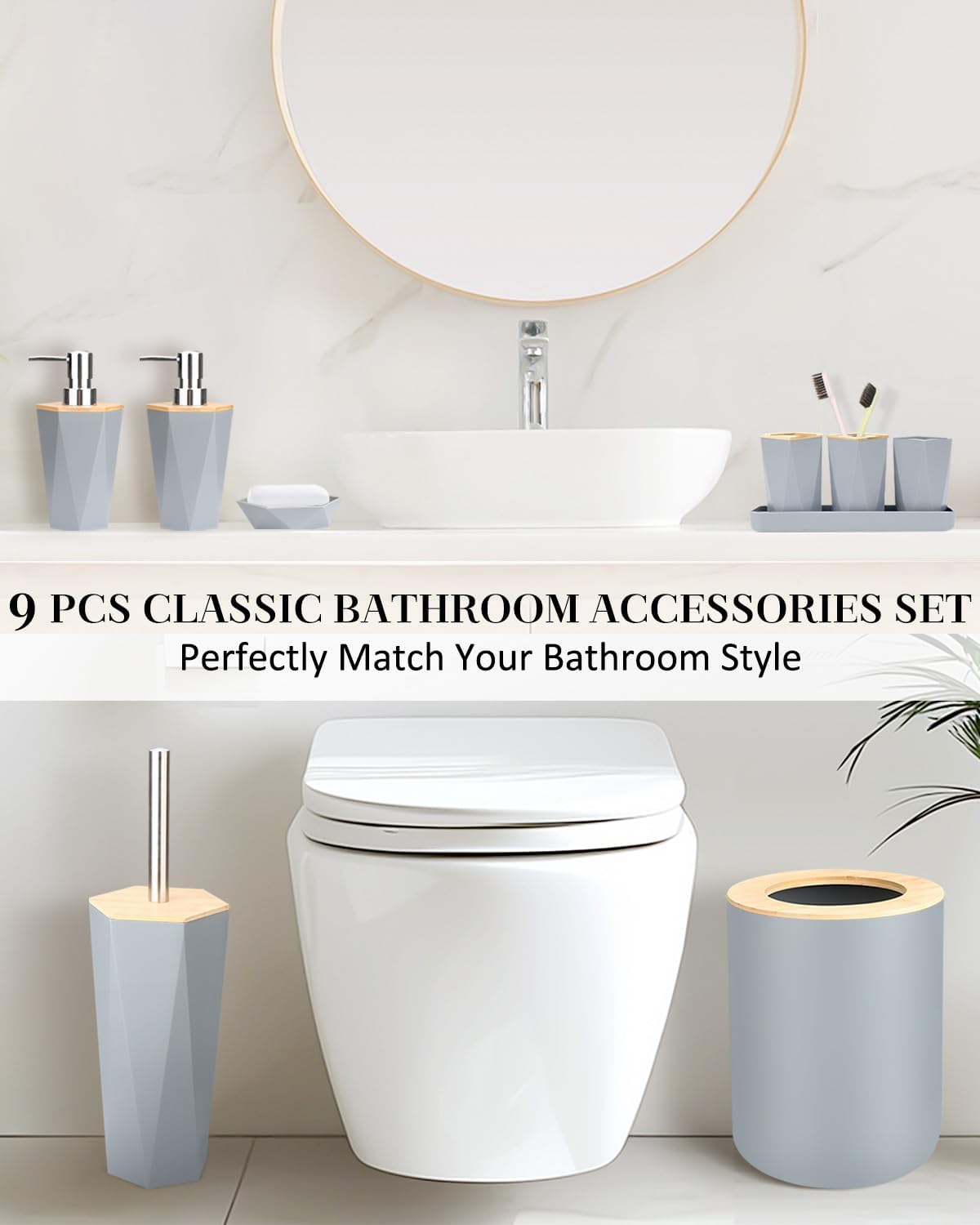 【Complete Bathroom Accessory Set】: The 9 pcs bathroom set is designed to meet your bathroom needs, with a toothbrush holder, two toothbrush cup, two soap dispenser, a soap dish, a trash can, a toilet brush and holder
