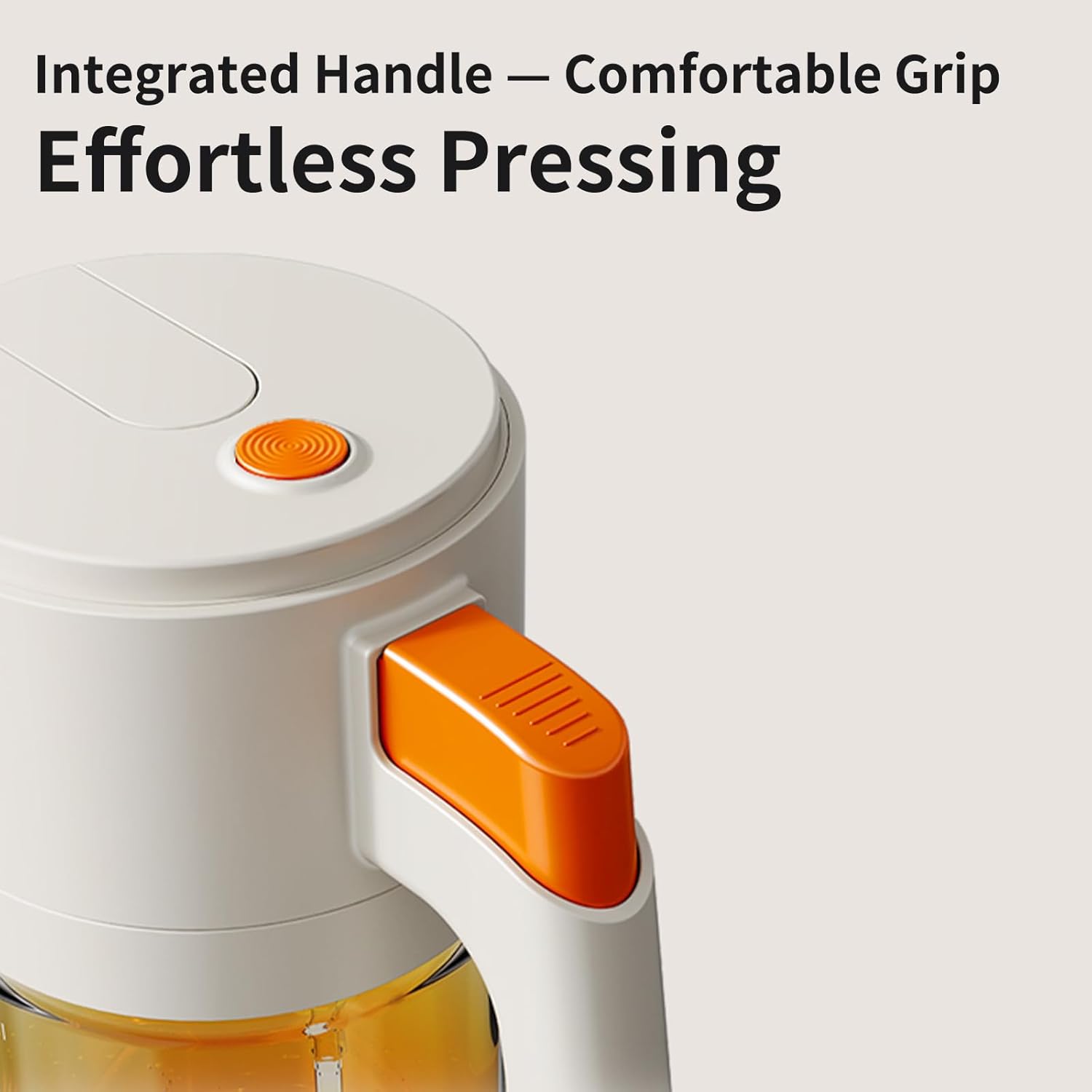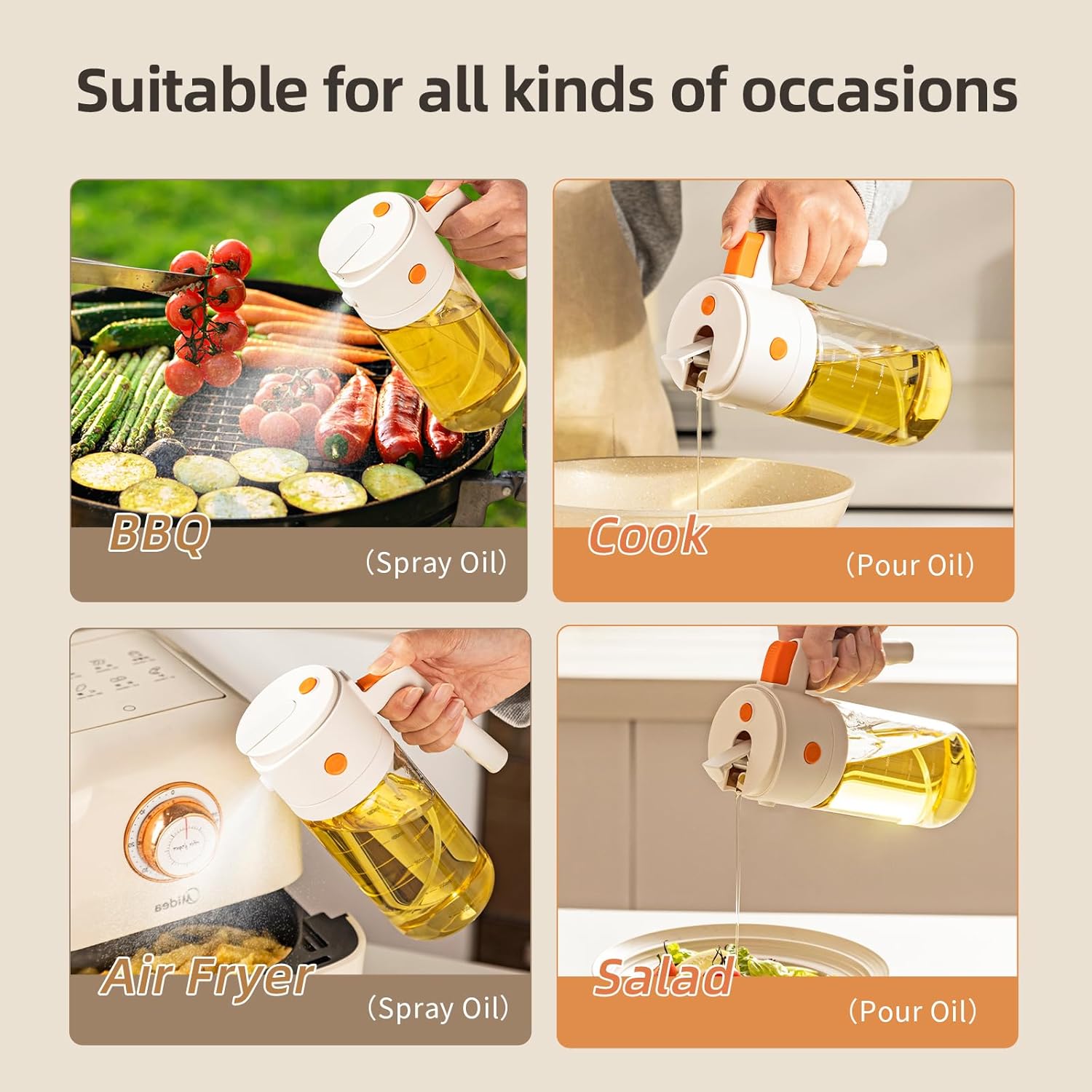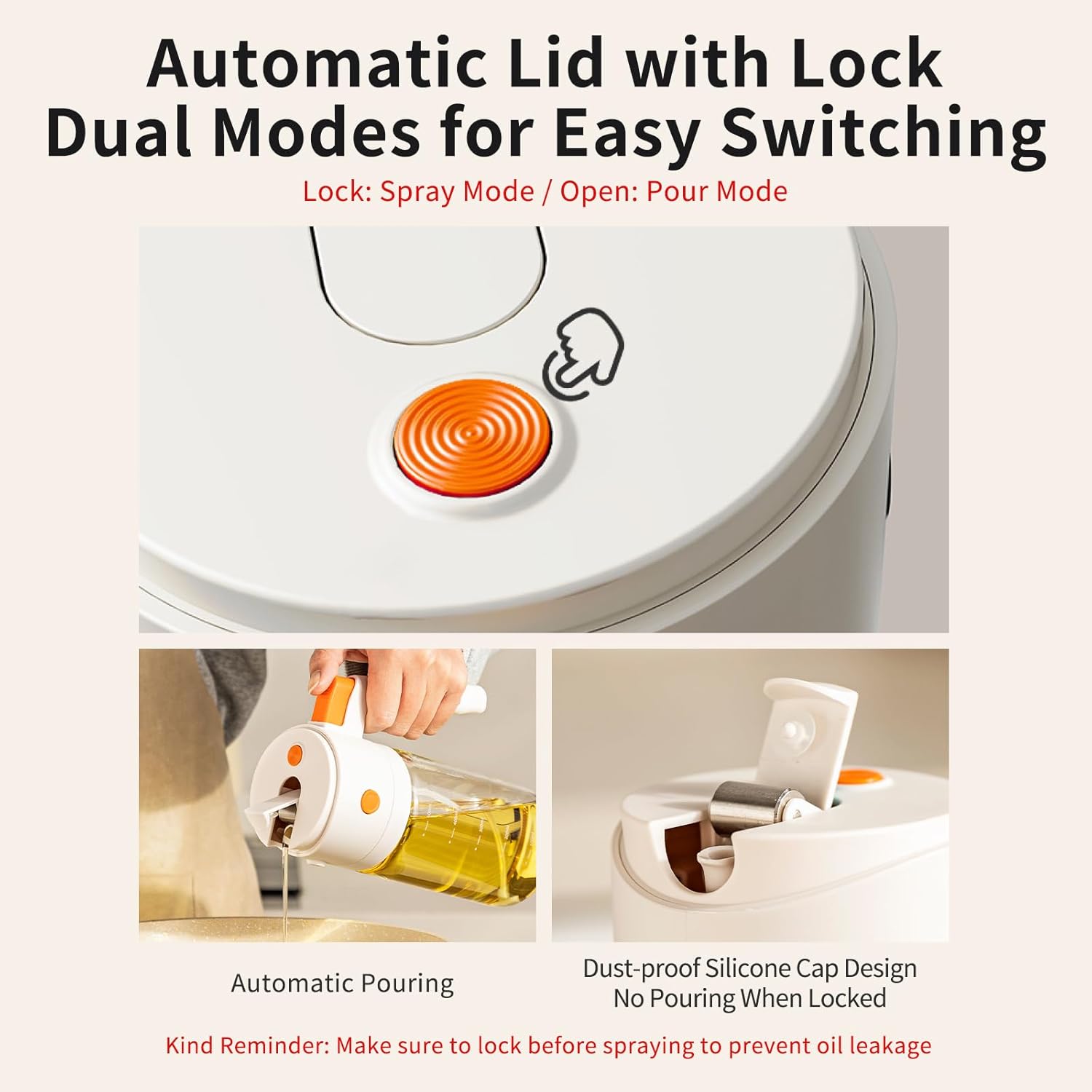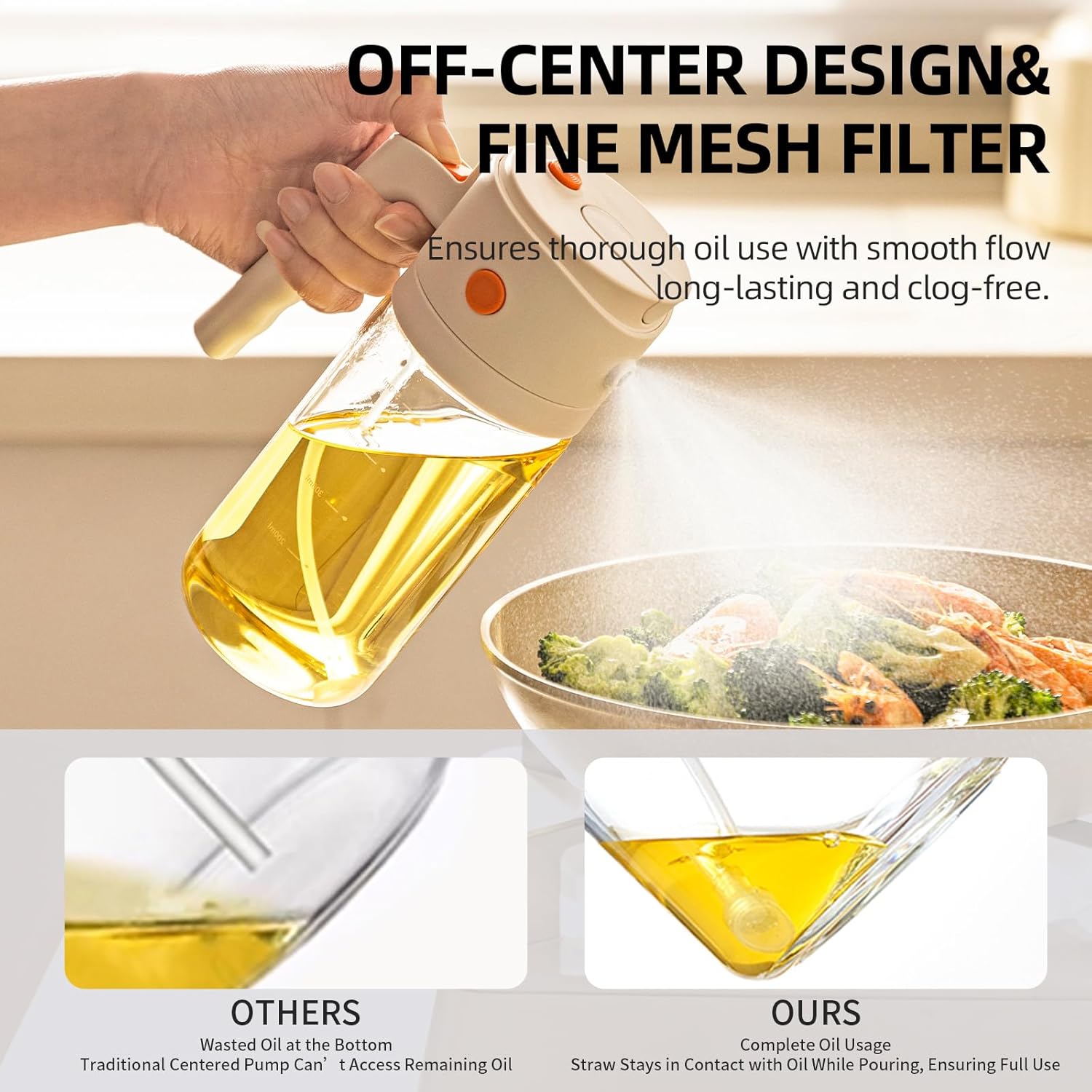 Comfortable Design: The oil dispenser bottle features an integrated handle for a better grip and a rear press button to avoid messy hands. Dual side lid buttons allow easy oil refills without twisting