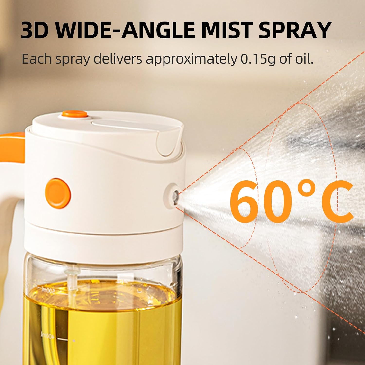 Precise Oil Control: Our olive oil mister delivers a consistent, ultra-fine spray with an advanced fan-spray atomizing nozzle to provide precise oil mist for even coverage; Each spray dispenses approximately 0.35 grams of oil, which is easily to control and measure your daily oil intake