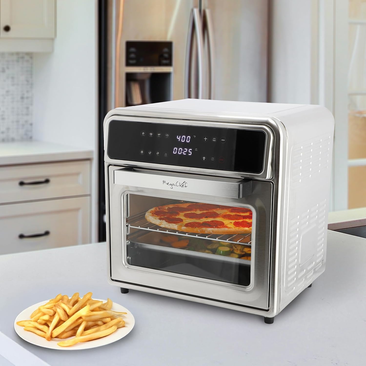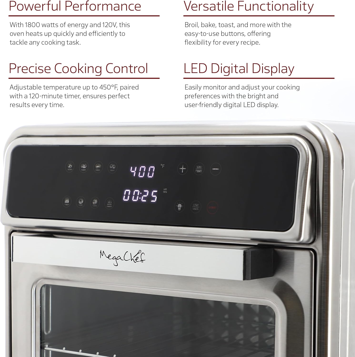 Introducing the MegaChef 21.13 Quart Digital Electric Multi-Function Air Fryer and Counter Top Oven, a compact powerhouse designed to enhance your kitchen capabilities. With a 21.13 Quart capacity, this oven is perfect for preparing small to medium-sized meals, offering a blend of efficiency and versatility. Operating at 120V and 1800 watts, it delivers rapid and consistent heating. The adjustable temperature control ranges up to 450°F, accommodating a wide array of recipes, while the 120-minute timer allows precise cooking management. Four stainless steel heating elements ensure even heat distribution, providing consistent and reliable cooking results. The fully stainless steel construction adds a sleek, modern touch to your kitchen, while the internal lamp and digital controls offer convenience and ease of use. The function switch allows you to choose between broil, bake, toast, and air fry, making this oven versatile for various cooking needs. Additionally, it comes with essential accessories, including an aluminum bake tray, wire rack, air fry basket, and crumb tray, ensuring you’re well-equipped to handle a variety of dishes. The indicator light keeps you informed of the oven’s operational status, making the MegaChef 21.13 Quart Digital Electric Multi-Function Air Fryer and Counter Top Oven an indispensable tool for efficient and stylish cooking.