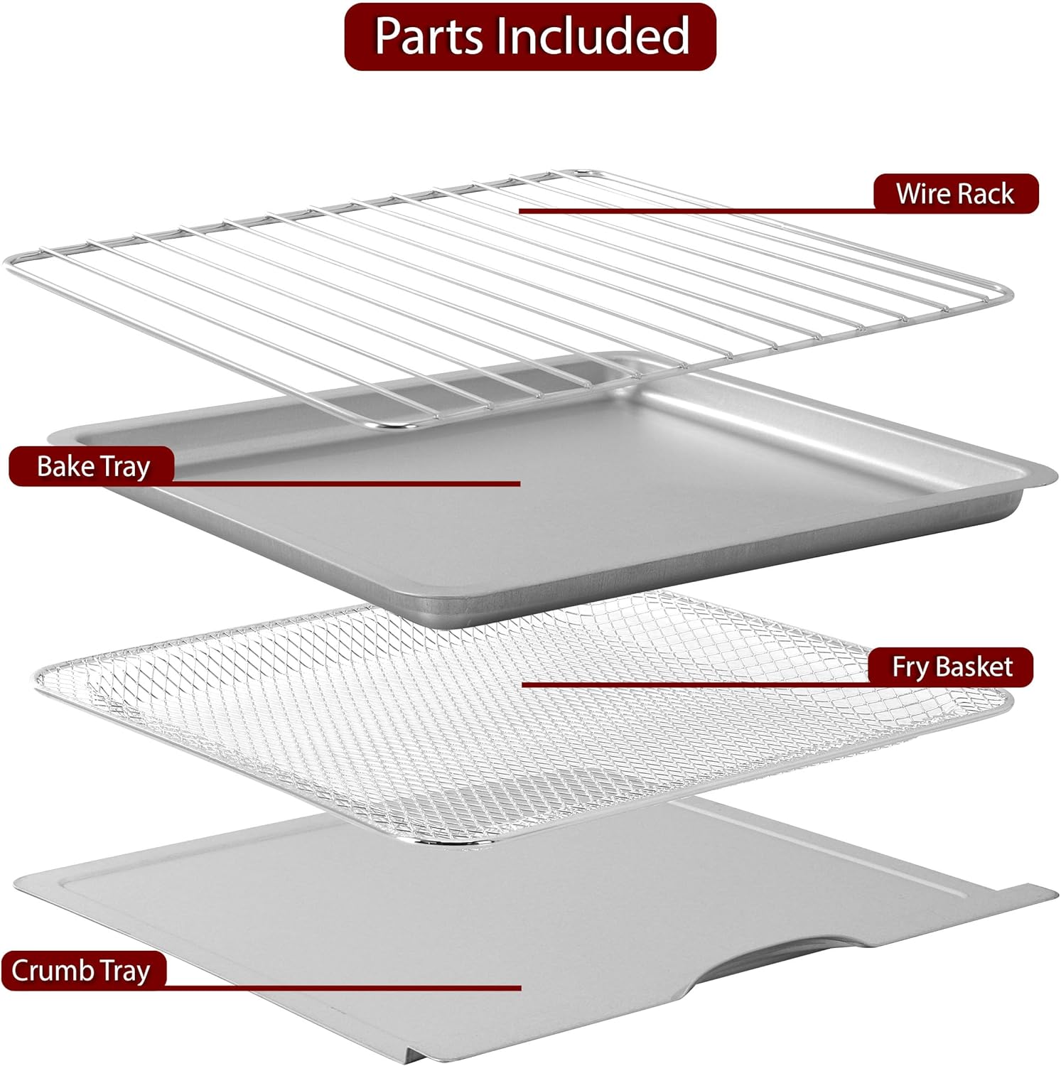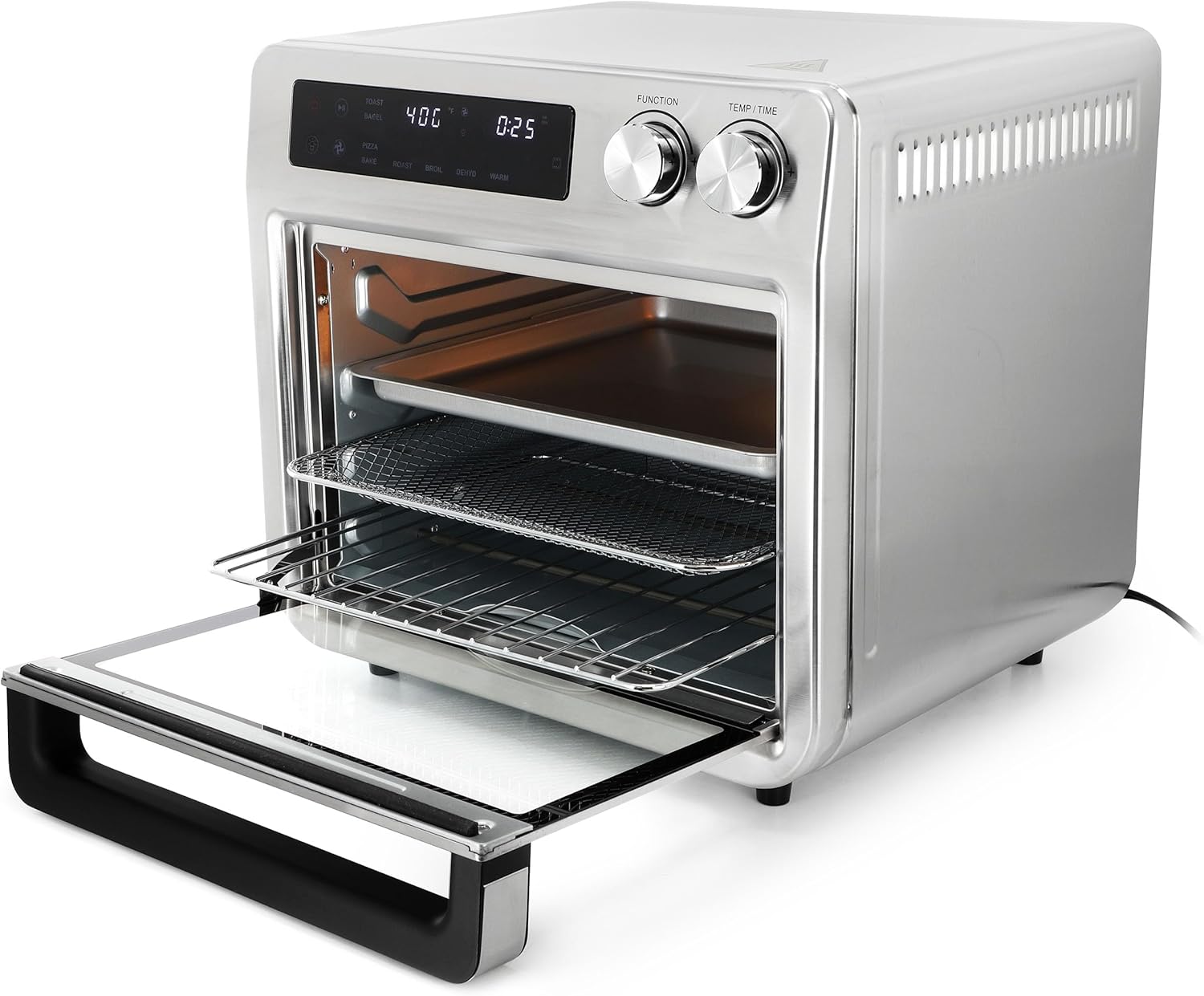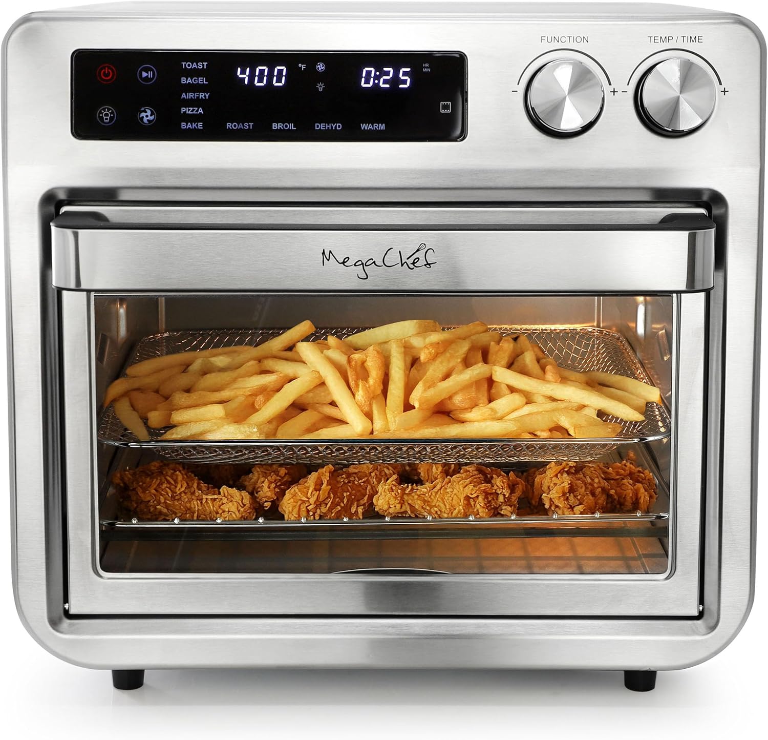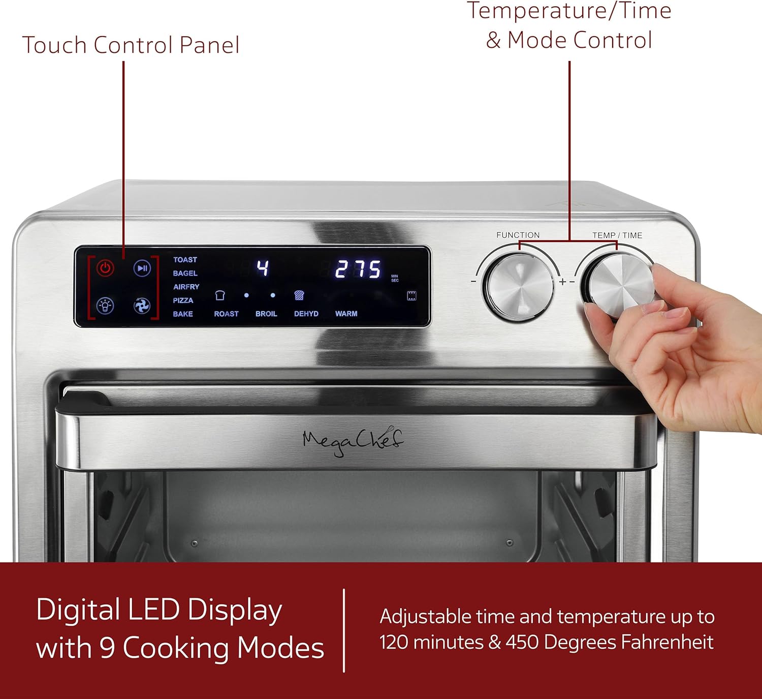Introducing the MegaChef 25 Quart Digital Electric Air Fryer Multi-Function Counter Top Oven, a sleek and powerful addition to your kitchen arsenal. With a spacious 25 Quart capacity, this oven is designed to handle a variety of cooking tasks, from everyday meals to special dishes. Operating at 120V and 1800 watts, it delivers efficient and consistent heat, ensuring your food is cooked to perfection. The adjustable temperature control reaches up to 450°F, allowing you to tailor the heat for different recipes, while the 120-minute timer ensures precise cooking every time. Crafted with a fully stainless steel exterior, this oven combines durability with modern elegance. It features four stainless steel heating elements for even heat distribution and an internal lamp for added visibility. The intuitive digital controls and function switch offer easy selection between broil, bake, toast and air fry settings. Included accessories-a durable aluminum bake tray, wire rack, air fry basket, and crumb tray-provide everything you need for versatile cooking and easy cleanup. The indicator light keeps you informed of the oven’s status, making the MegaChef 25 Quart Digital Electric Countertop Oven an essential tool for efficient and stylish cooking.