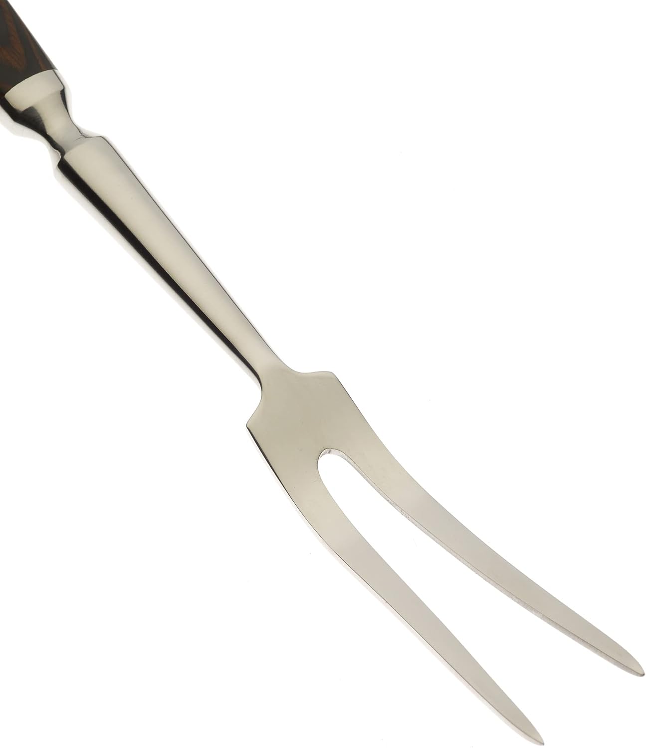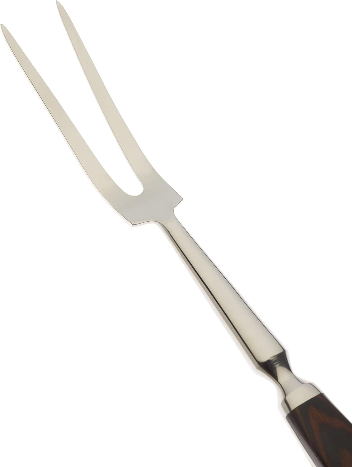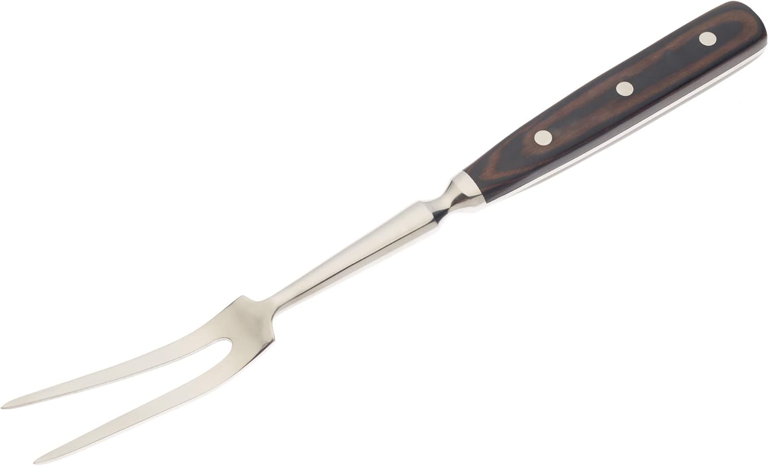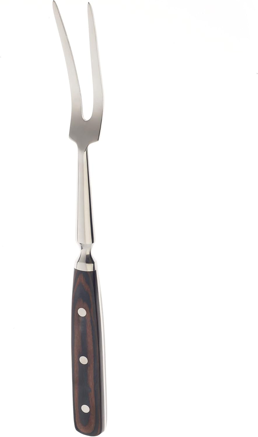 This Praxis 12-1/4-Inch Forged Fork with Wood Handle is made with high carbon steel blade for durability. The Forged Fork is made from a forged construction for incredible strength and has a triple-riveted rosewood handle. The fork has sharp tines to easily pierce foods.