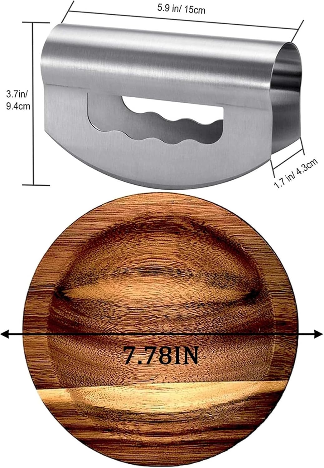 Stainless Steel Double Blade Salad Chopper, Double Blades and Ergonomically Design, This attractive acacia wood board is designed to work brilliantly The circular board is approximately 1 inch (3 cm) thick and has a diameter of 9.4 inches (24cm).
