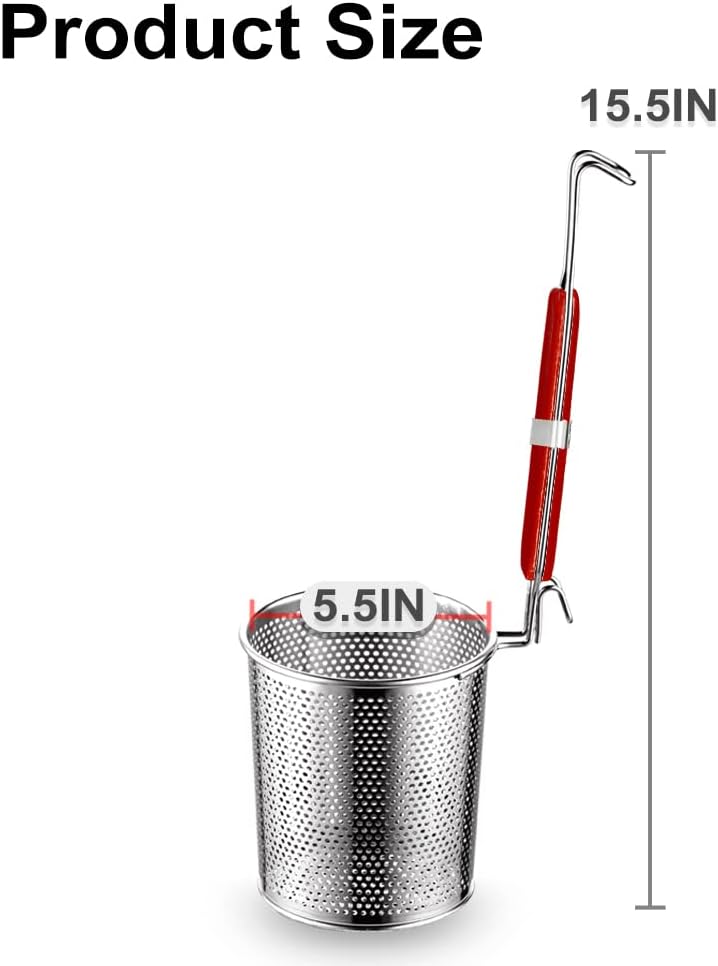 Deep basket design holds foods securely for easy transfer and serving; long wooden handle keeps hands out of harms way Cook, reheat and drain noodles, pasta, dumplings, and matzo balls, blanch vegetables, deep fry, and more; perfect for individual portions, too Lightweight and durable; hand wash in warm, or safe for dishwasher.
