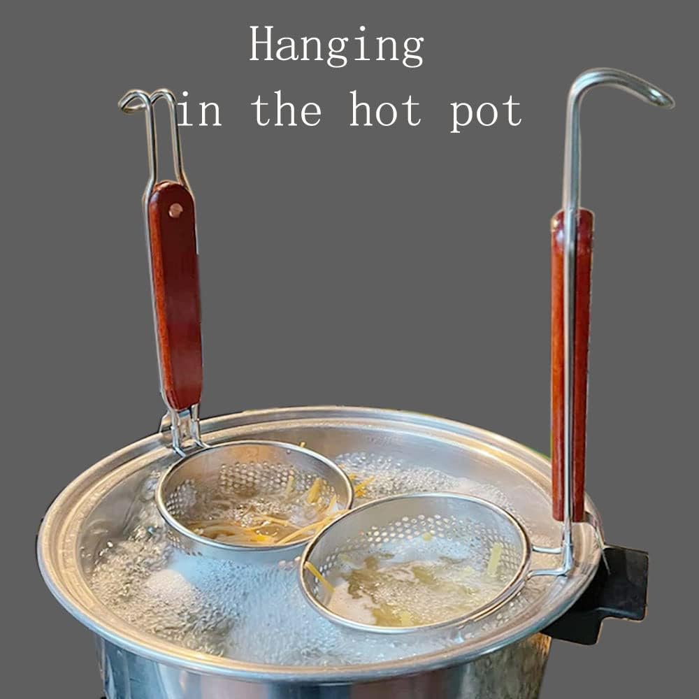 Made from stainless steel mesh with sturdy plate steel; wooden handle with 2 hooks conveniently hangs on the pot while in use and stores away easily.