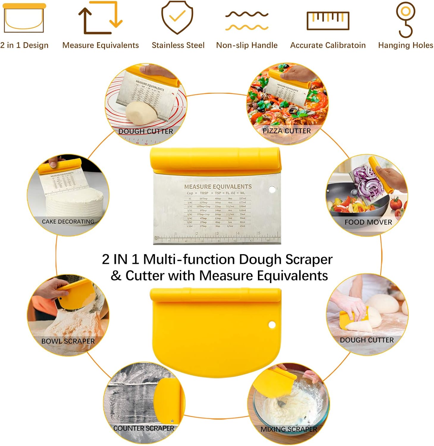 2 IN 1 Dough Scraper & Pizza Cutter Set: The baking tool set is multifunction, such as dough scraper, cake server, pizza cutter, food remover, dough cutter / chopper, etc. Clean kitchen counters of crumbs and dried dough. Smooth out frosting/cream on cakes, divvy up butter and much more, and Use cake scrapers to create your own unique cake shape ! All of them has a hole so you can hang them within easy reach.