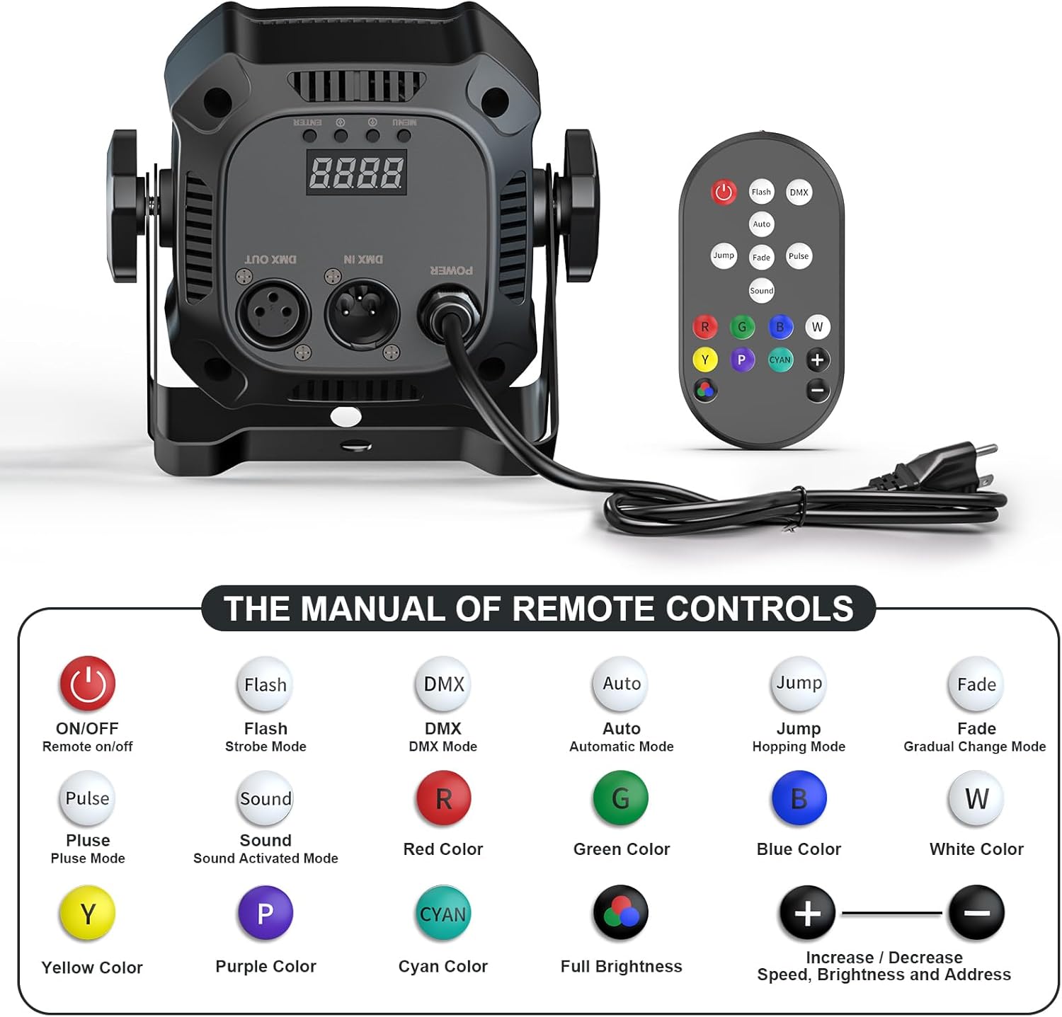 【Par Lights with Multi-function Operate Modes】: There are 5 control modes: auto, sound activated, DMX512, master-slave, remote. Also the remote supports multiple modes switching, including jumping, fading, pulsing, strobe, automatic and voice-activated modes. So you can operate our stage lights as you wish.