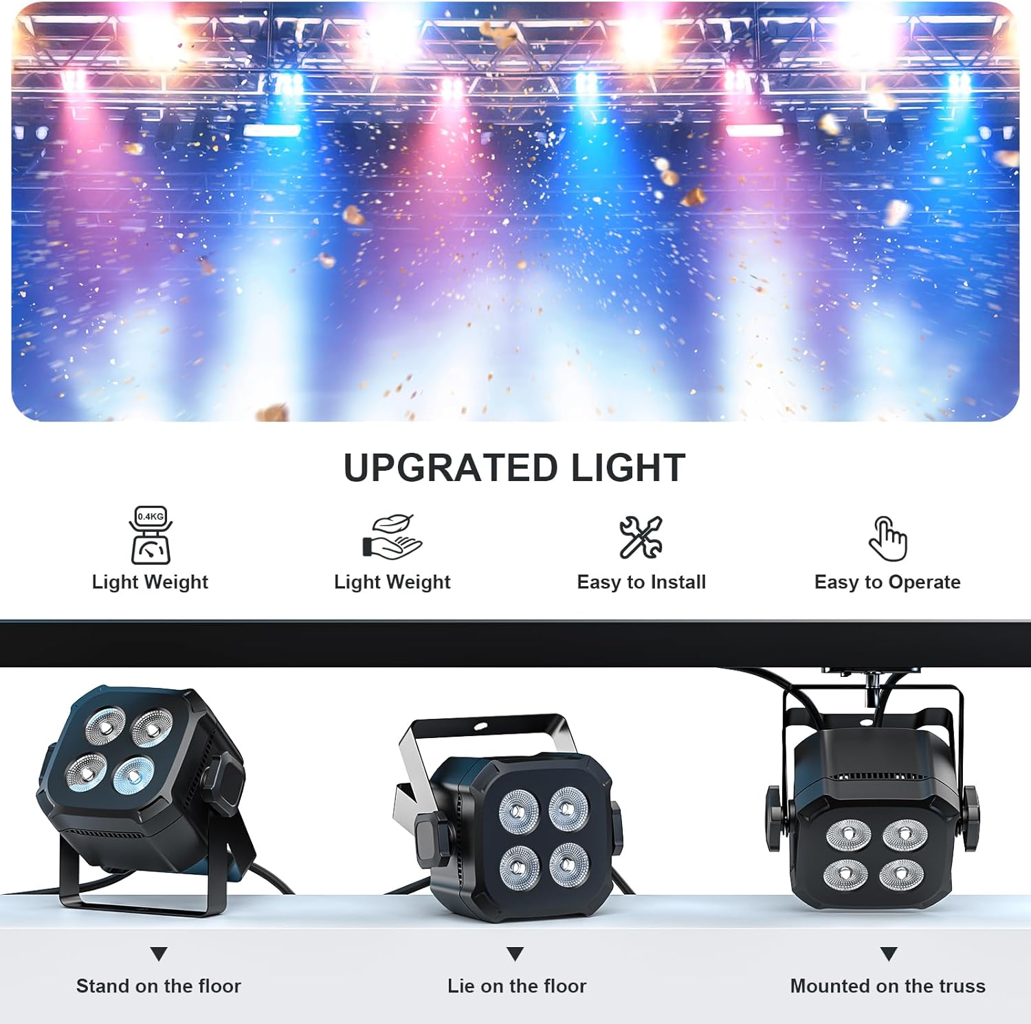 【Lightweight & Easy to Install】: The par light weigh 0.4kg, which is more light than other stage lights. The size of our LED par light is 5.3*5.3*5.3 Inch. Moreover it is very simple to install and easy to carry and move. You can place the light on the floor, on a stage light stand, or wherever you want.